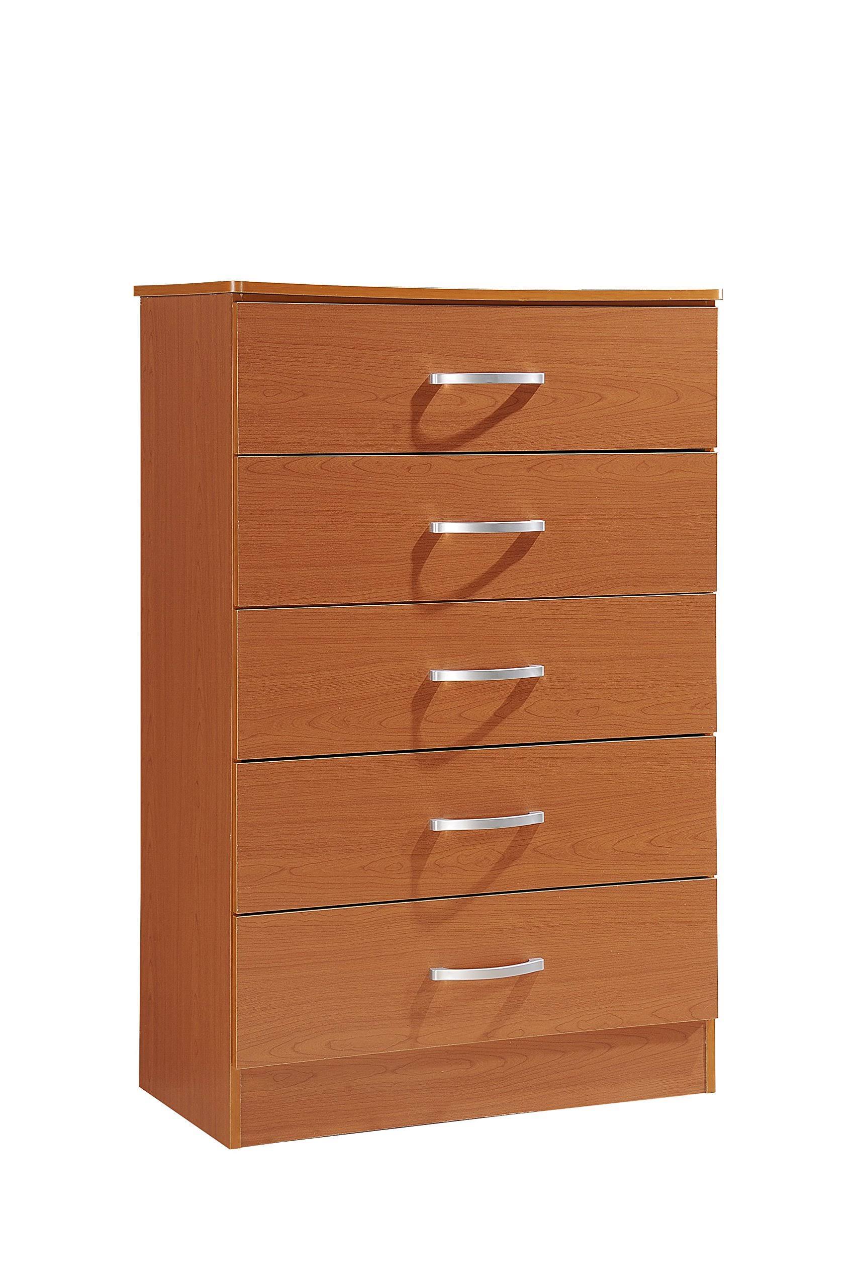 Dimensions: 31.5W x 14.6D x 47.3H in. . Durable compressed wood frame. Choose from available finishes. 5 drawers. Simple contemporary design. Perfect for storing folded pants, tees and accessories, the Imports 5 Drawer Chest is a highly functional piece in your bedroom. The simple contemporary style easily blends with your current decor. Compressed wood gives it a highly durable frame that is strong enough to provide reliable support for years. Silver-tone handles make it easy to open and close the drawers. Color: Cherry.