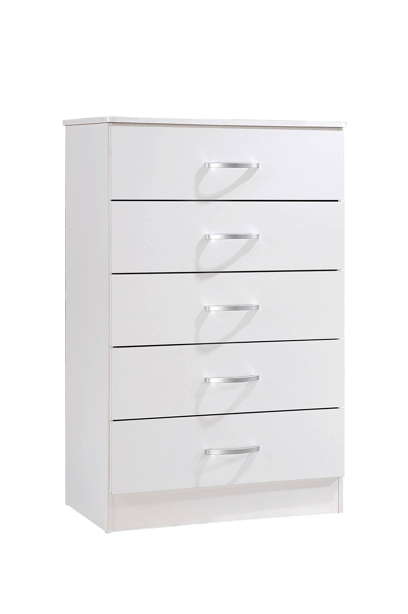 The Five Drawer Chest is a simple yet functional piece to add to your bedroom. With its contemporary styling you can choose according to your decor, as this chest is available in multiple finishes. It is manufactured entirely out of wood which it makes it durable for many years. The Chest has five drawers and provides ample storage space accommodating all your clothes perfectly. Each drawer has sufficient support under them to handle extra weight, making the drawers sturdy. Up the drama by topping this simply chic chest with an abstract sculpture and large framed family photos. Features : Support under each drawer to handle extra weight Metal drawer glides Use alone or combine with matching bedroom collection pieces Available in Beech, Cherry, Mahogany, Black or White Assembled dimensions: 47.3 in. H x 31.5 in. W x 14.6 in. D Hardware and manual included which makes set up fast and easy