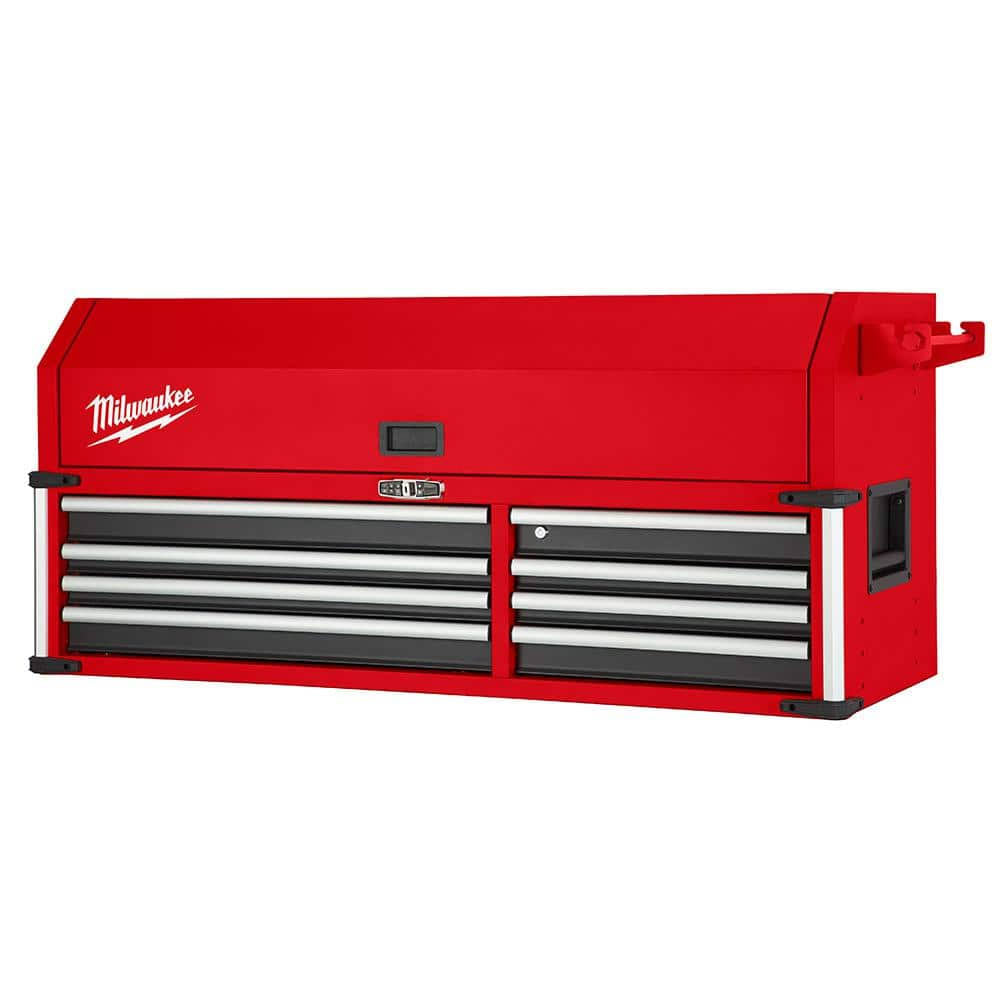 Our 56. High Capacity Steel Storage Top Chest is the best equipped tool storage solution in its class. The tool storage chest provides you with a reinforced angle iron frame, 150lb soft close drawer slides, 5,000 lb weight capacity, 18 gauge steel construction and 6. industrial casters for superior durability. The steel tool chest gives you 20,029 cubic inches of storage space and is designed with a variety of innovative features like our MILWAUKEE built-in power center and power tool organizer to maximize your productivity.