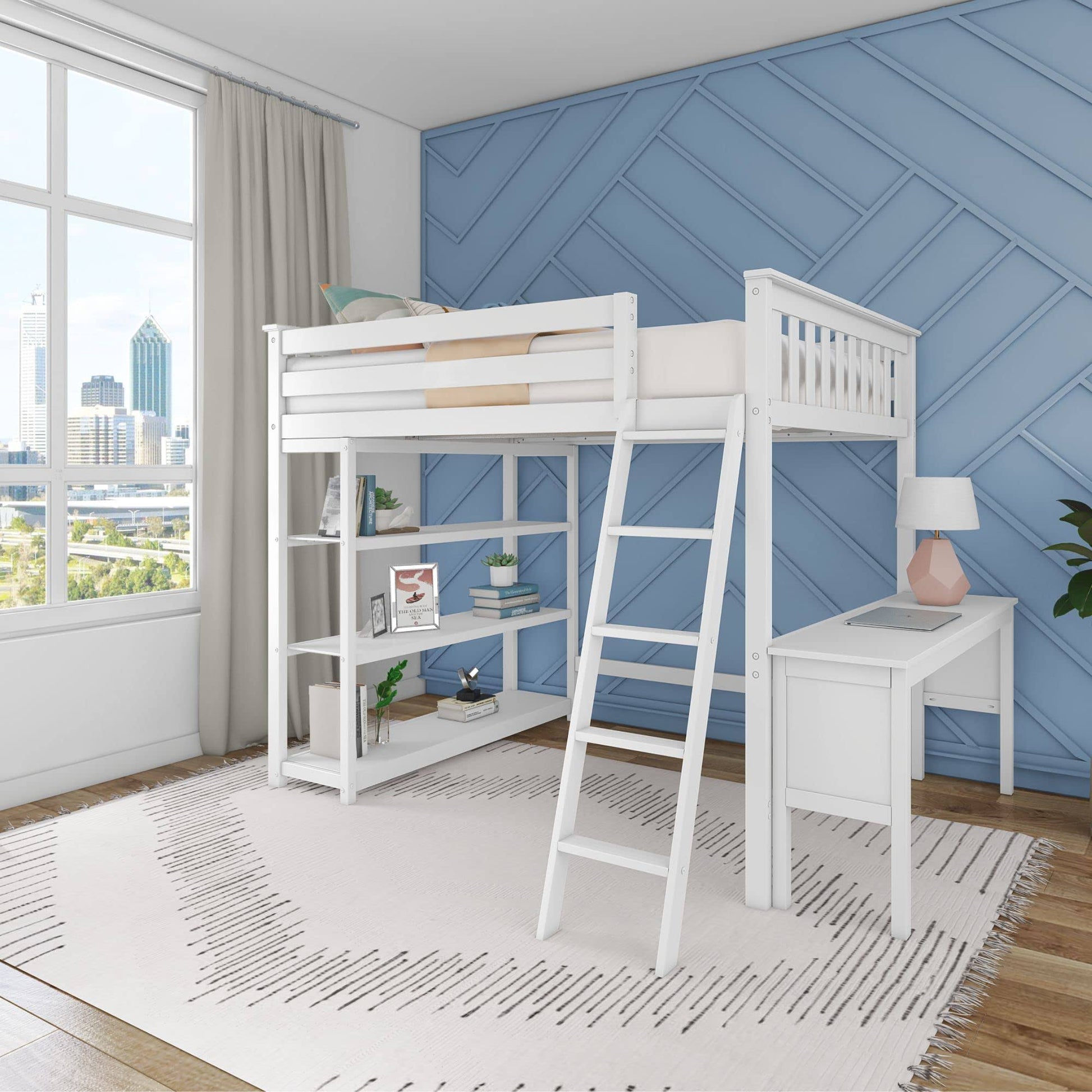 Turn your kids room into the best place to sleep, study and store with our Full-Size High Loft Bed with Bookcase and Desk. With three spacious shelves, theres plenty of room to organize your toys and school essentials. A large desk is perfect for all your study time favorites. What Kids Will Love: Space to relax! Plenty of under-bed space = the perfect lounge area. Perfect for schoolwork! Desk is the ideal size for studying. A 3-shelf bookcase keeps your toys and other bedtime favorites close by for easy access. What Parents Will Appreciate: Solid New Zealand pine wood construction provides superior strength and durability. Clean, non-toxic, low VOC finishes contribute to a healthy home. A large bookcase keeps their everyday items organized for a neat and clean room. Includes easy-to-read instructions, hardware and all the tools you need for a quick setup. Safety is our #1 priority. Max & Lily is a member of the Maxwood family of brands – the kids furniture experts – bringing a tradition of superior quality, safety and fun!