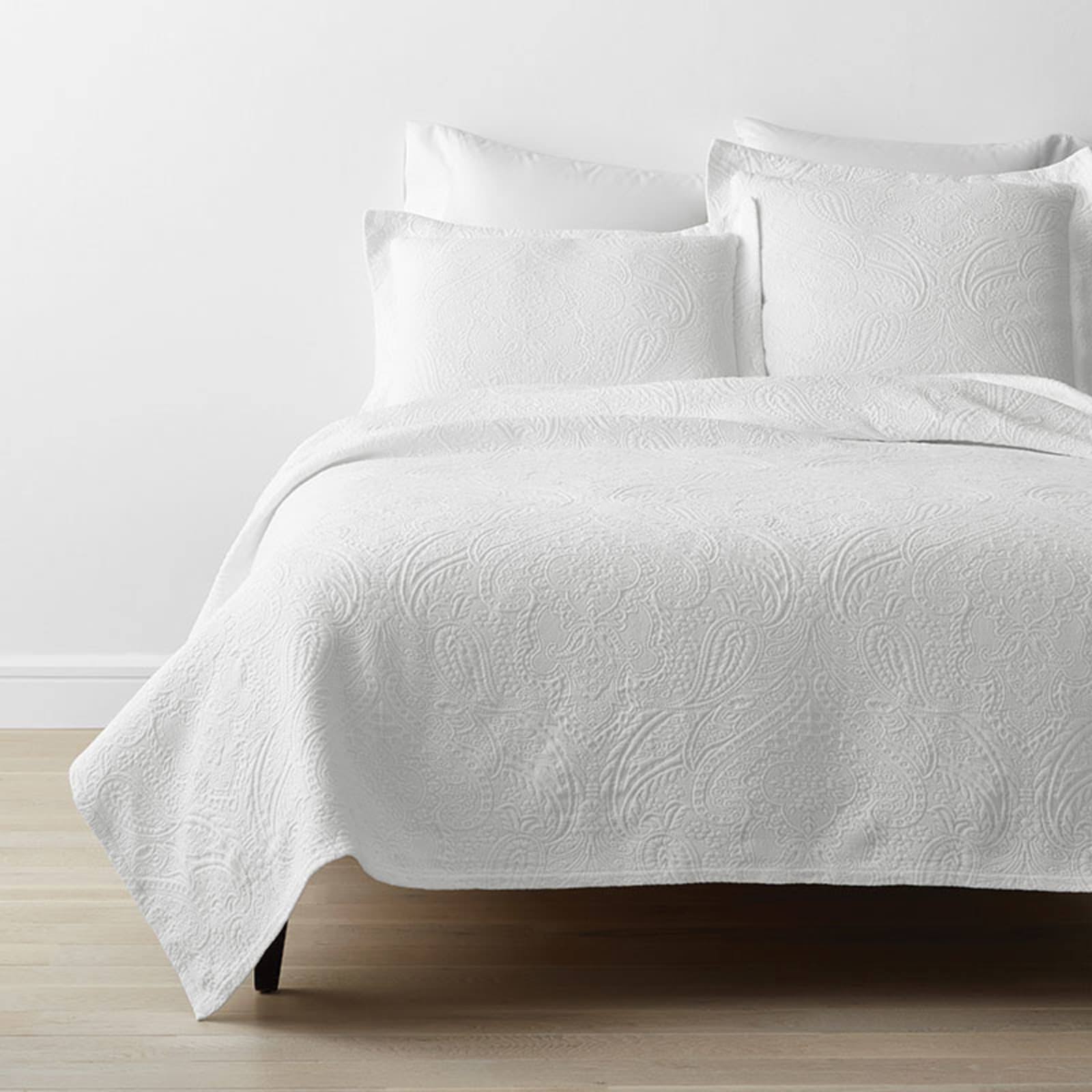Give your bed a polished look with this matelassé coverlet. 100% cotton. Washed for a soft, lived-in hand. Entire collection includes a coverlet and sham, each sold separately. Made in PortugalScrolled with grand-scale paisleys, this elegant matelassé coverlet offers just the right amount of texture and pattern to the bed, layering beautifully with prints and solids alike. Crafted in Portugal of decadently soft cotton that works great on top of bed or under a comforter when the weather gets cooler.