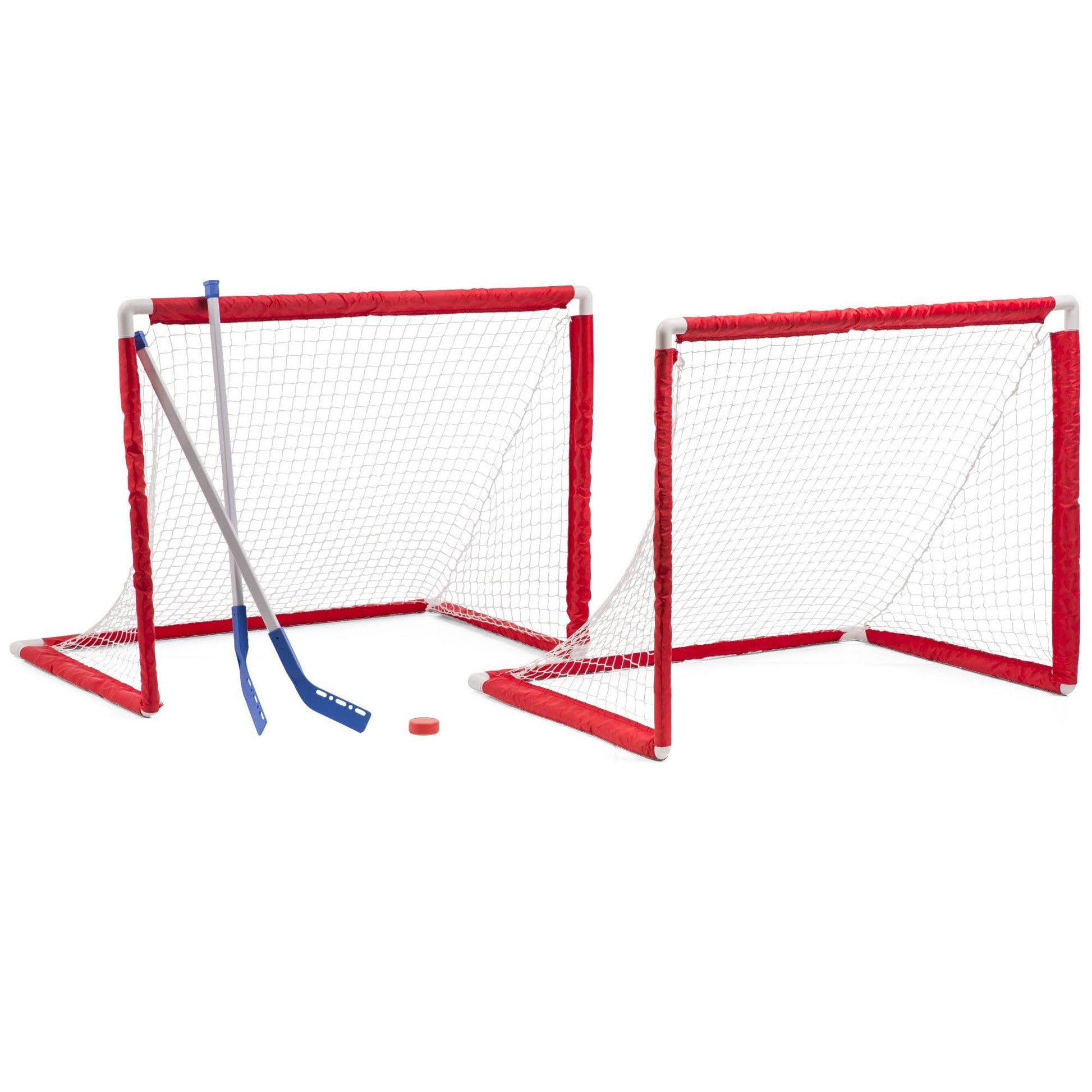 Enjoy hockey season year-round with our Indoor and Outdoor Hockey Game Set, perfect for the driveway, hallway OR playroom! This all-inclusive family-fun game includes 2 easy-to-assemble plastic goals, 2 hockey sticks and 1 hockey puck for a quick 2-player game. Grab friends and family for a skill-building game of hockey, perfect for beginners and experts alike, and have fun while perfecting hand-eye coordination and accuracy. This versatile, instant hockey game can be played on any hard surface indoors or out—set it up in a hallway or basement, or turn your driveway into a hockey arena and invite friends and family for a competitive showdown. Plus, the lightweight goals are easy to assemble and break down, which makes it a perfectly portable game for vacation, family get-togethers, or birthday parties! Adult assembly required.