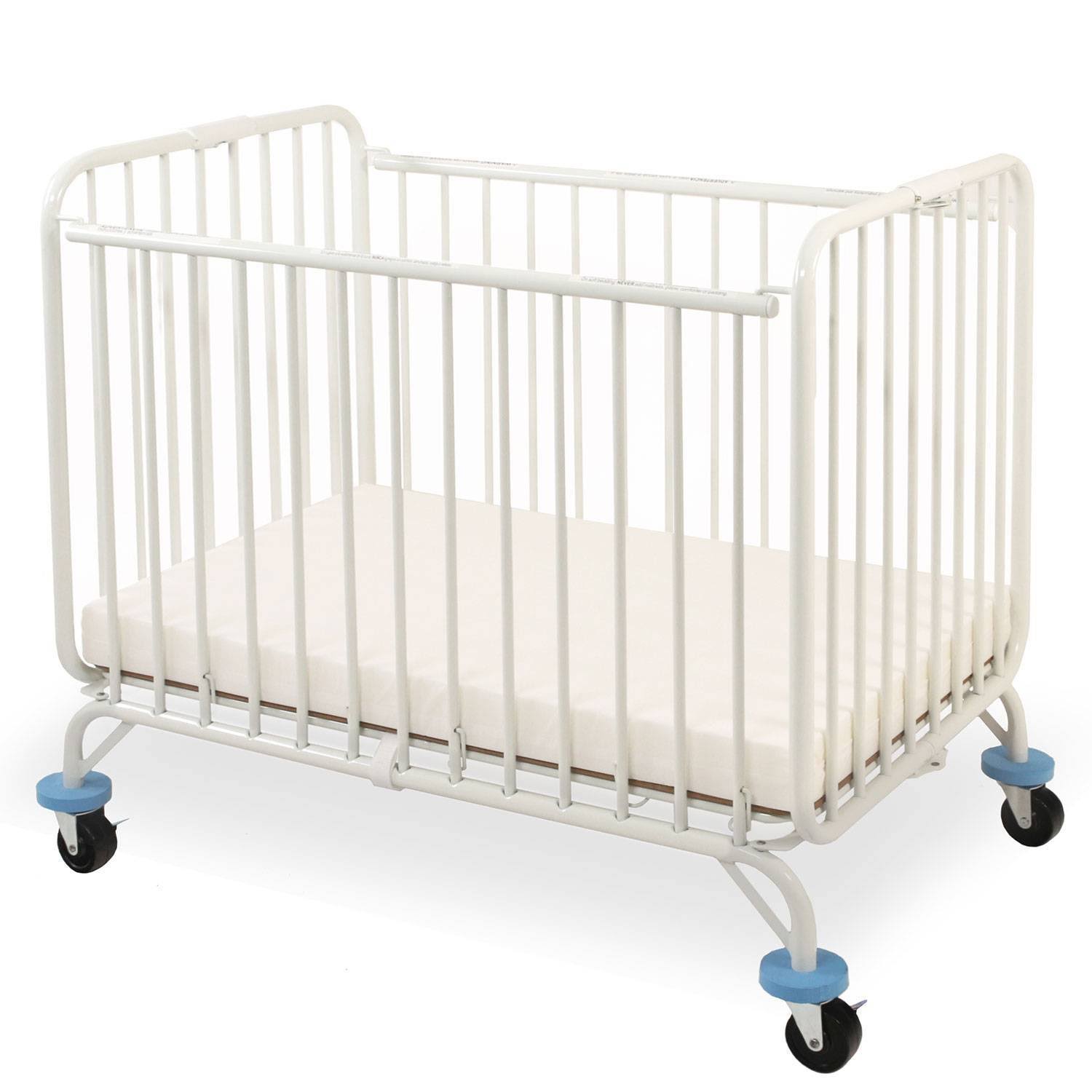 Institutional Quality folding (23 x 38) metal crib. Comes fully assembled and folds away for easy storage. Easy to clean and scratch resistant non-toxic powder coat finish in white. Includes a deluxe 23 x 38 x 2 thick foam mattress that is compliant with Federal Flammability standard 16 CFR 1633. Braced leg construction assures lateral rigidity in transport. Features exclusive, Lock-down, safety floor system. Stationery side rails and one position mattress support. Easy to move from room-to-room, folded or open, on heavy duty casters. Foam bumpers are included to protect doorways and other furniture.Bilingual instructions in English and Spanish. Optional nylon storage cover is available. Meets the Mandatory CPSC 16 CFR 1220 regulations for non-full size cribs. JPMA Certified and meets ASTM 2710 commercial crib regulations to withstand the rigors of a day care or other commercial environment.