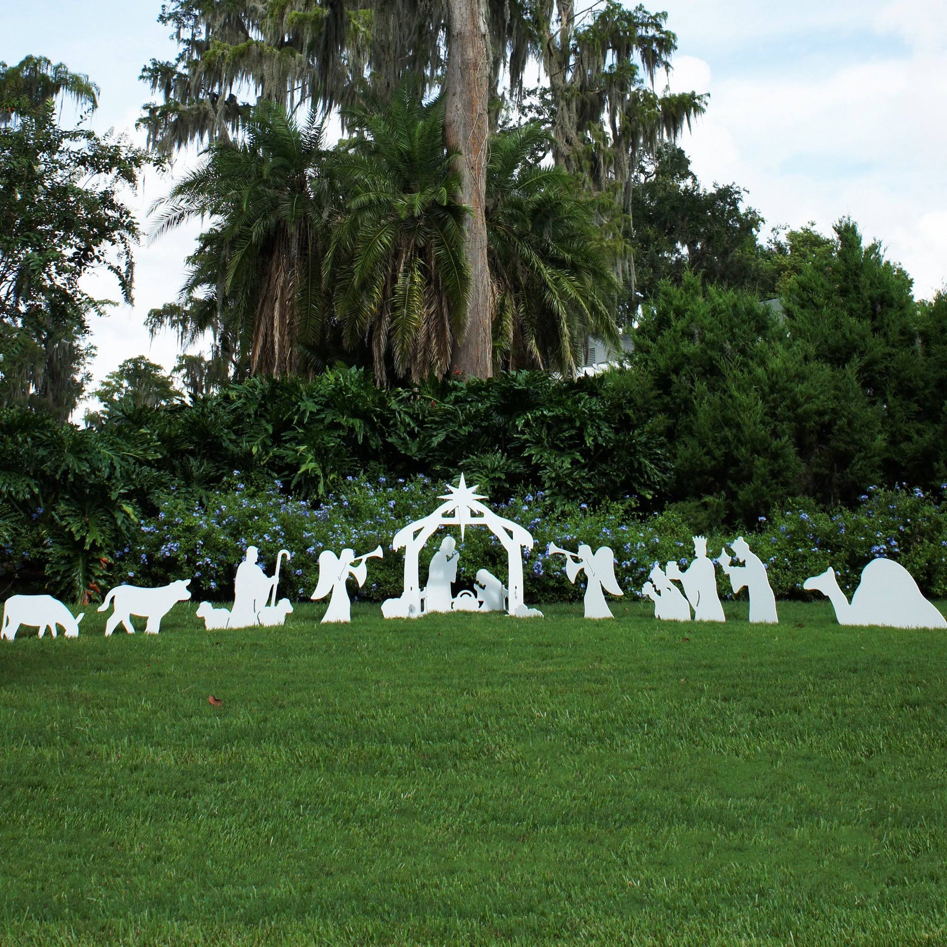 Composed of 1/2 thick marine grade plastic sheet. It includes: holy family with manger 50tall x 46.5wide x 23deep. Pair of upright angels: 27.75 tall x 23 wide (each). Front two wise men: 28.5tall x 27.4wide. Third wise men: 28.75tall x 16.5wide. Shepherd with sheep: 27.75tall x 33.25wide. Calf: 20.50tall x 28.875wide. Donkey: 15tall x 25wide. Camel: 22tall x 41wide.