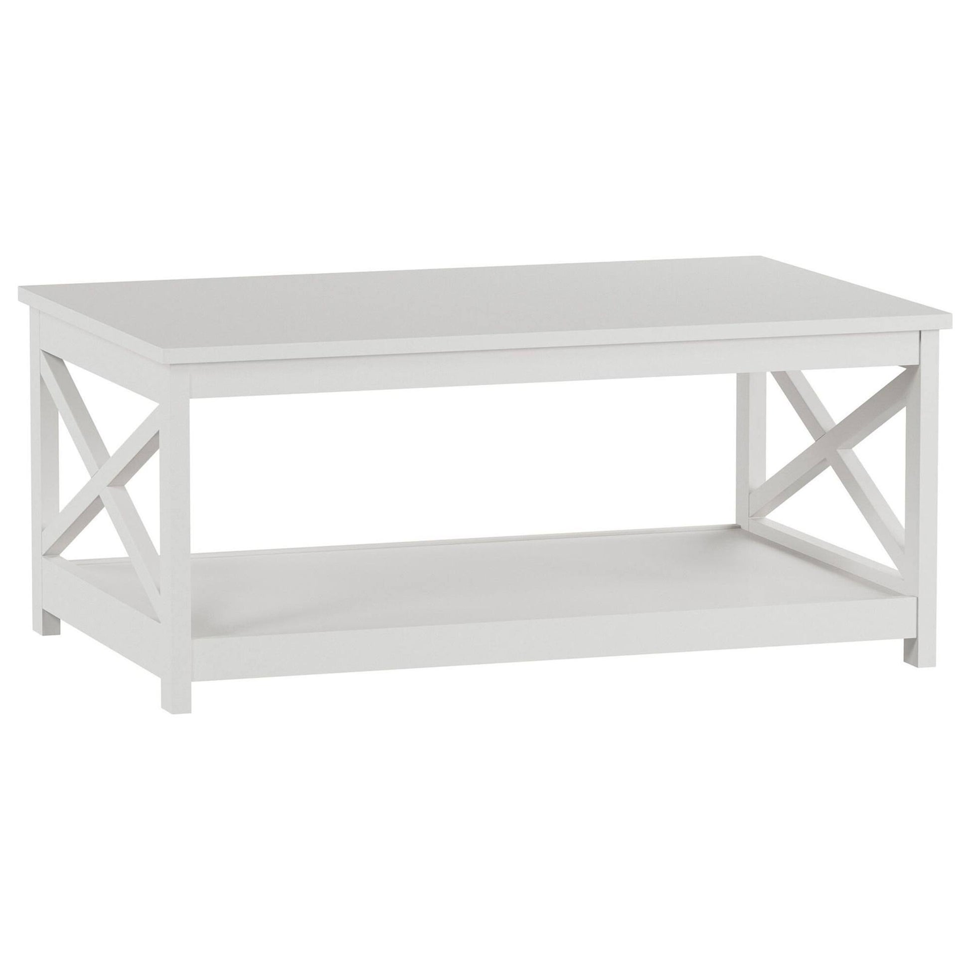 This product is a beautiful and practical addition to your living room decor. Blending the clean lines of contemporary style and functionality, this sofa table features sturdy X-shaped legs and a storage shelf to keep books, magazines, and other household items within reach. The low profile of this table won t interrupt sight lines or conversation while lounging on the couch. Constructed of durable MDF wood and painted in a classic color, this coffee table can hold up to 33 pounds on each shelf. Whether you use this versatile coffee table in your home or office, or as a TV stand for a 32-inch television, it is sure to complement any room for years to come.