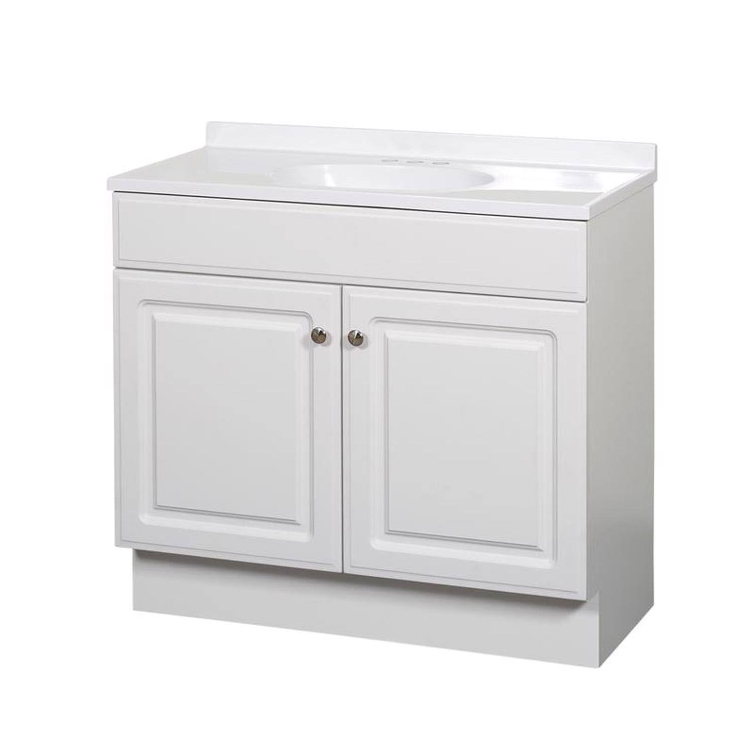 Complete your bathroom renovation or makeover project with the stylish, spacious, and quality-made Zenna Home Vanity with Cultured Marble Top. This beautiful bathroom vanity and sink set feature a timeless yet contemporary design that will complement your current bathroom decor. Its 36-inch width is excellent for large bathrooms and provides extra counter space. The sparkling white cultured marble sink and backsplash pair marvelously with the vanity s white finish. Brushed nickel hardware adds a sophisticated accent. The vanity is complete with two raised panel cabinet doors that open to reveal ample space for storage.