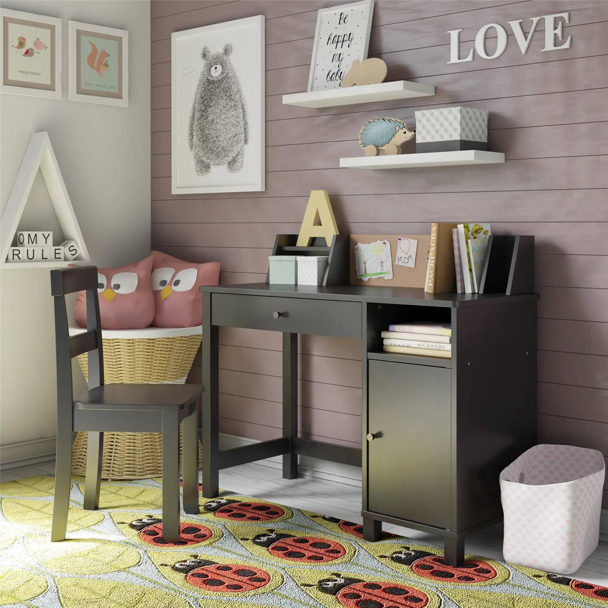 Round out your child s bedroom with an Home Abigail 36W Kids Desk With Chair. This desk with ample storage gives your child plenty of room for projects, coloring books and other essentials. The included wooden chair provides sturdy support. Sturdy engineered wood desk. Built-in storage hutch. Concealed cubby. 1 drawer. Includes a wooden chair. Sleek black design.