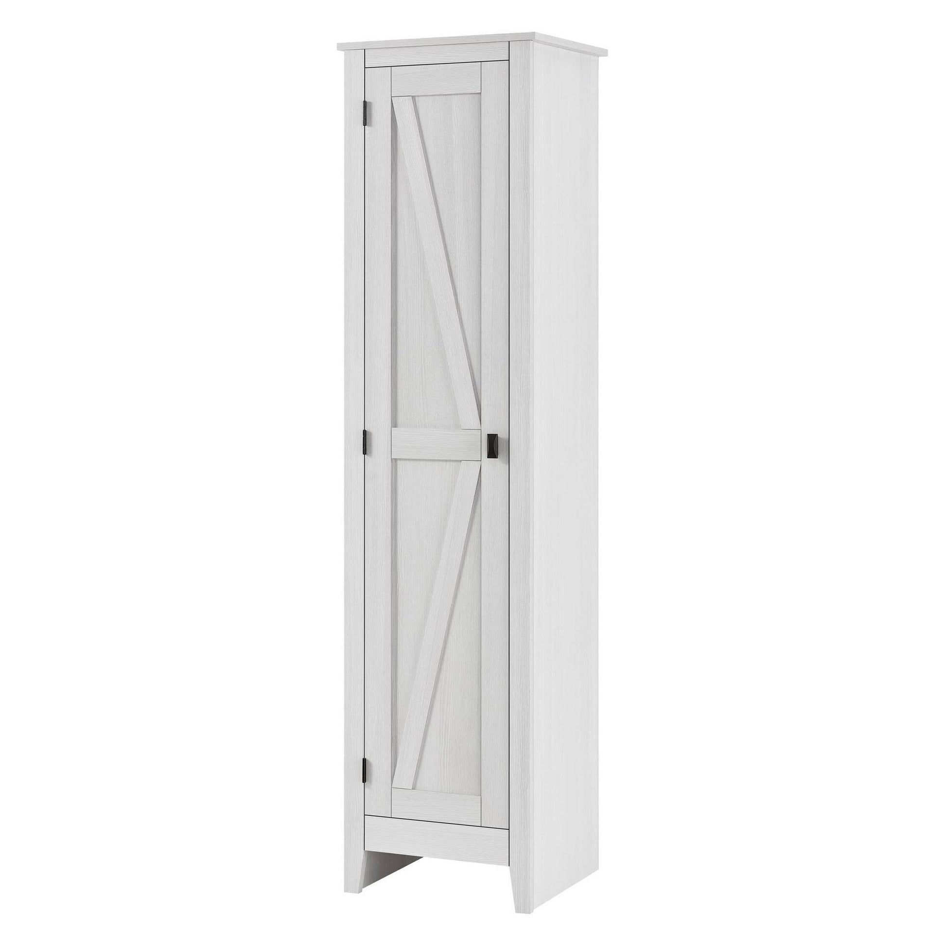 The Room and Joy Brookside 18 Wide Storage Cabinet is a stylish way to stay on top of your organization. The rustic barn style design and sleek tapered feet gives the look of an old weathered cabinet but the sturdy laminated particleboard and MDF make this cabinet the perfect piece to house your home office supplies, extra linens, seasonal clothing, nonperishable food and more! Open up the door to 4 spacious shelves, 2 adjustable, to fit items of differing sizes. The door can be assembled on either the left or right side so you can arrange your room however you need. The Brookside Cabinet is rmended to be assembled and moved by 2 adults. A wall anchor kit is provided for extra safety and security. After assembled, this cabinet measures to be 71.89H x 18.19W x 15.67D. Color: Sandy Pine.