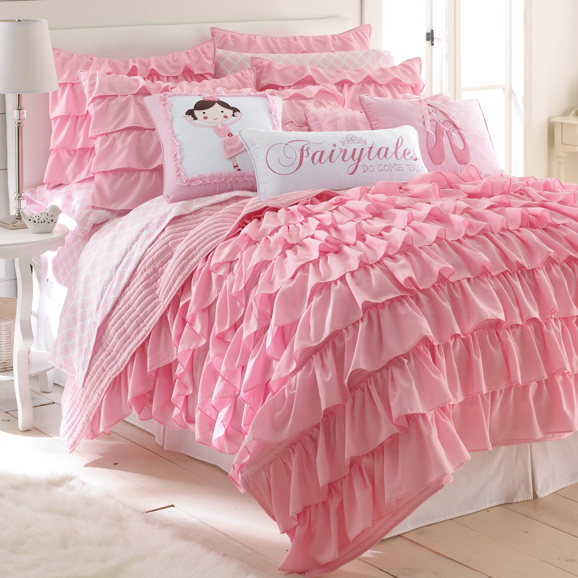 The Bella Reversible Quilt Set by Home is inspired by princess fairy tales. Offered in pink, this design will immediately transform your kid s bedroom. This reversible quilt features large elegant pink ruffles shingled on a simple pink quilt on the front, reversing to a simple quilted design on the back. The quilt and sham have a brushed polyester front and back, filled with a cotton-rich filler, and are machine washable. Your kid will surely enjoy this for years to come!