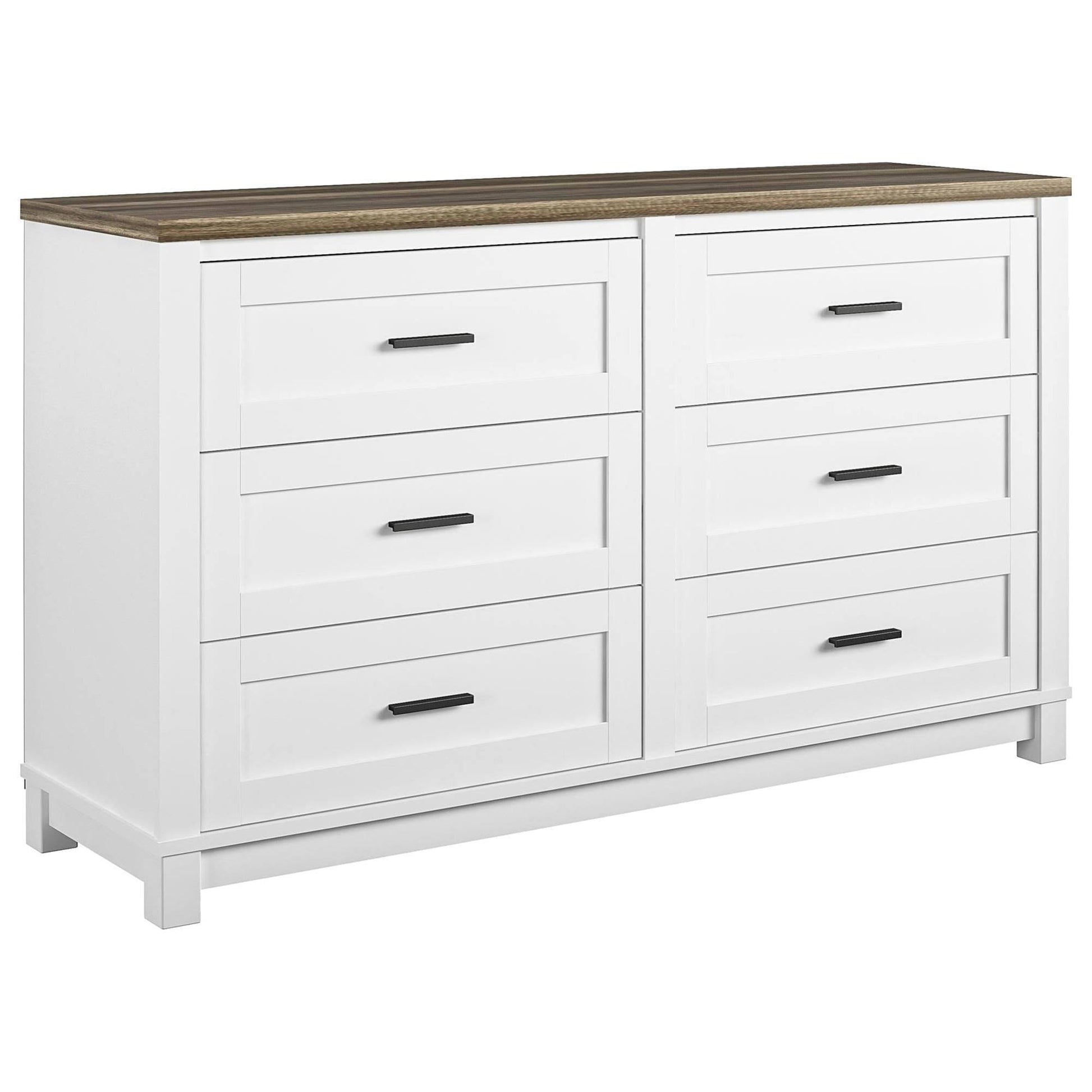 The Home Chapel Hill 6 Drawer Dresser perfectly combines style and functionality to give your bedroom the extra storage space it deserves. With 6 spacious drawers, the Dresser provides ample room to organize all of your pants, tops and undergarments just the way you like. You wont have to worry about cramming everything into the closet or digging around for your favorite shirt anymore. In addition to the extra storage, the 6 Drawer Dresser has a charming look thatll fit into multiple décor styles. Made of laminated MDF and particleboard, the white finish and light brown woodgrain top surface gives the Dresser a beautiful two-tone look. A wall anchor kit is included to secure the Dresser to the wall. Two adults are recommended to assemble. Once assembled, the Dresser measures to be 32H x 54W x 15.75D.