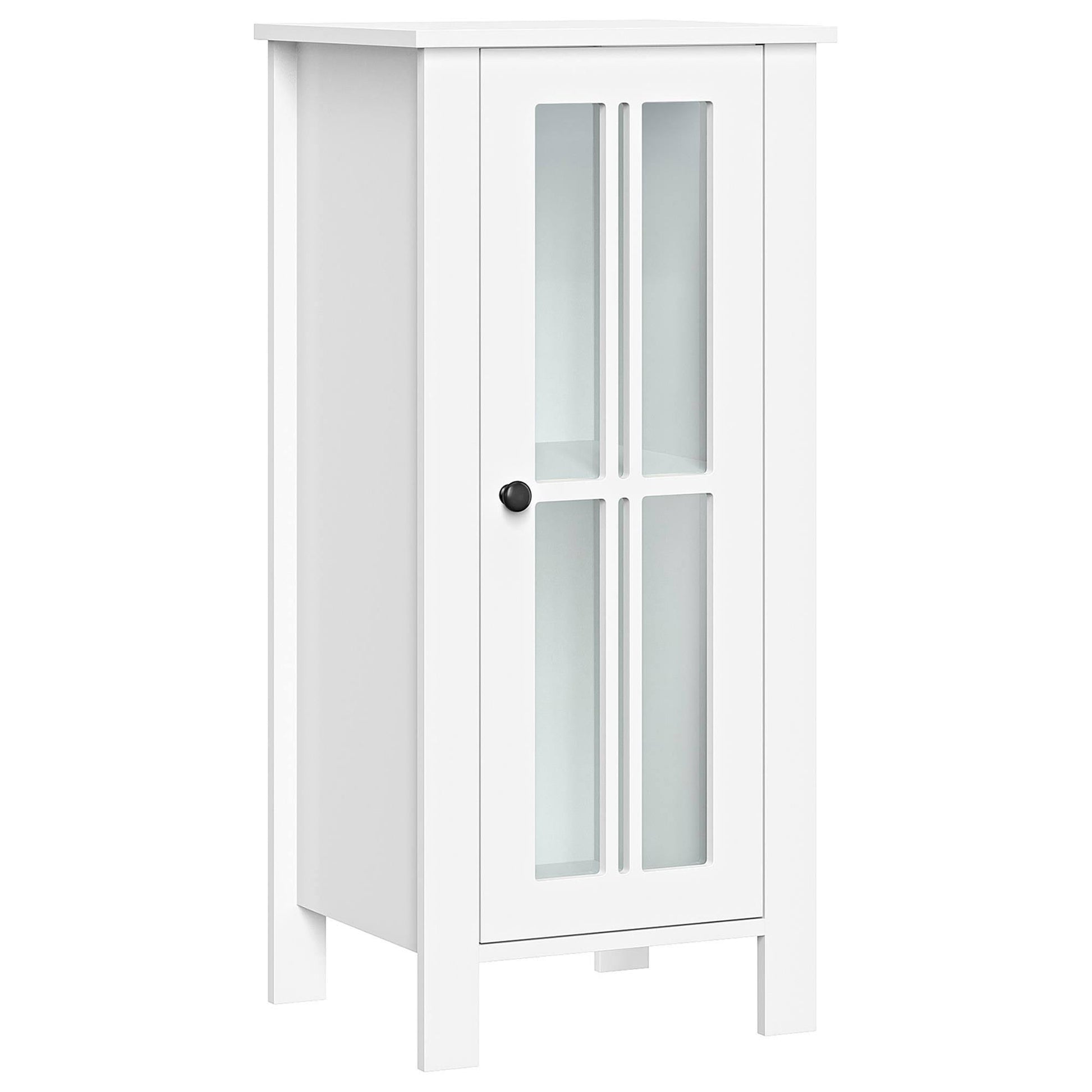 Add storage and style to your space with this floor cabinet featuring a windowpane-style glass door. At just under 14 wide and 12 deep, its small footprint can squeeze into narrow spaces, but is spacious enough to house a variety of items. With its soft-close hinges and interior fixed shelves, this freestanding cabinet is perfect for storing extra hand towels, wash cloths, toilet paper and more. Utilize the open top shelf to display your favorite home decor pieces or a basket filled with extra toiletries, then finish off the look with one of the included two knob choices (polished silver or black). Includes detailed instructions for easy assembly and an adjustable anchor bracket to secure to the wall for added safety and stability. Pair with additional RiverRidge Home Danbury Collection items to add even more stylish storage to your space.