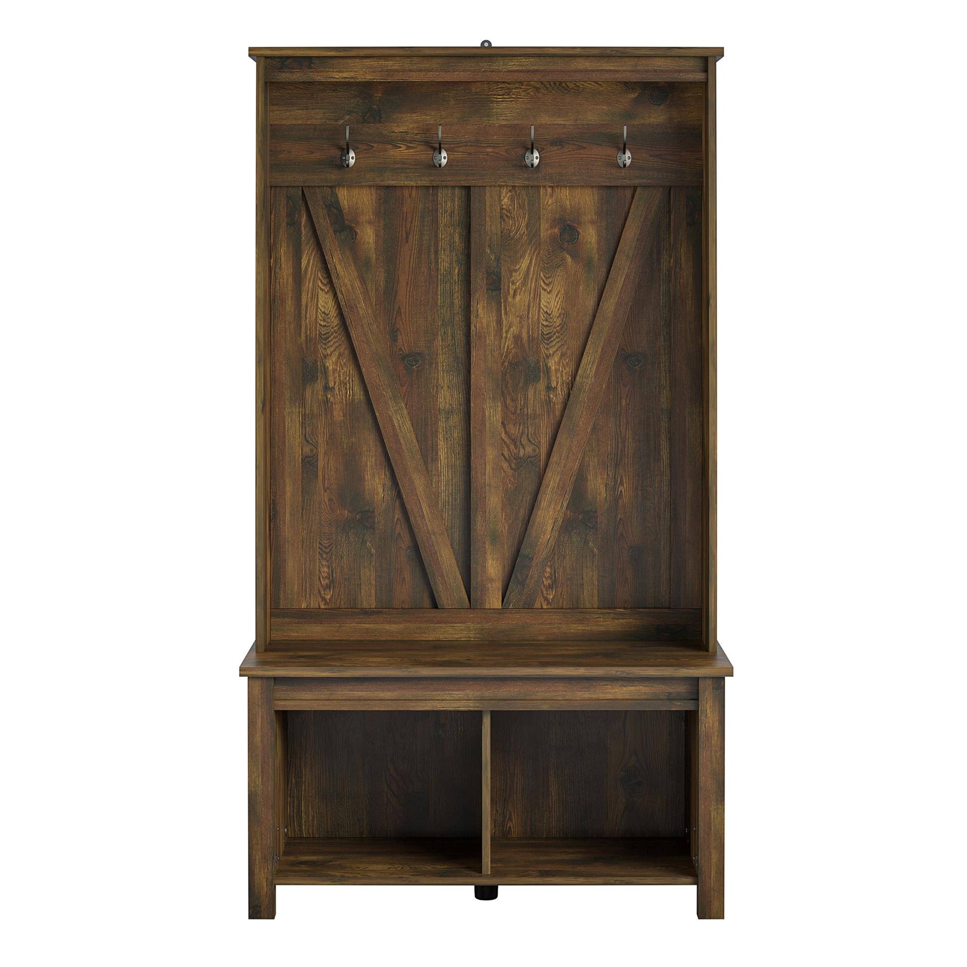 Create a warm, inviting entrance into your home with the Ameriwood Home Farmington Entryway Hall Tree with Storage Bench. The weathered brown woodgrain finish on the laminated MDF and particleboard adds a classic feel to this piece. Have everything you need to walk out of the door in one place with the Hall Trees metal hooks and storage cubby. Hang coats, bags, and hats on the 4 hooks or organize shoes in the lower cubby. Put your shoes on or take them off on the convenient bench. A wall anchor kit is included to secure the Hall Tree to the wall and prevent tipping injuries. Two adults are recommended to assemble. Once assembled, the Entryway Hall Tree measures to be 67.99H x 37.99W x 15.67D.