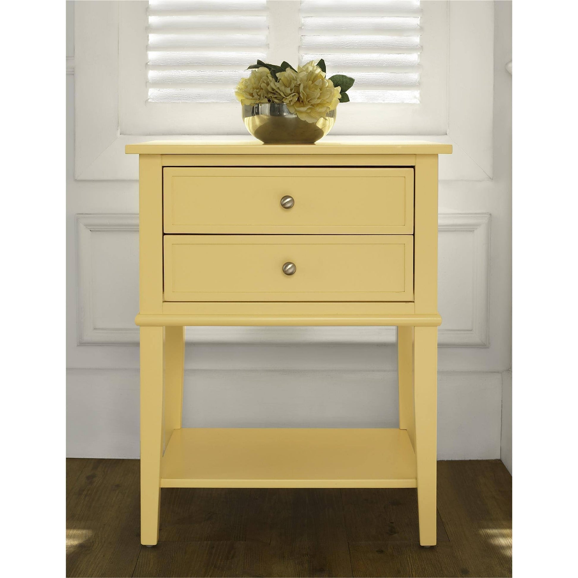 Keep essential items within arms reach with the Home Franklin Accent Table with 2 Drawers. This beautiful Table stands perfectly next to your sofa or recliner and is just the right size (28 h x 22w x 15 5/8d). The Accent Table features 2 spacious drawers for storing remotes, coasters, magazines and other household items and a smooth top surface to hold a lamp or family photo. The lower open shelf is the perfect place to stack and organize your reading materials such as books or subscription magazines. The straight lines, silver knobs and light blue painted finish of this piece gives this accent table a subtle neutral feel while still adding an elegant touch to your living space. The Franklin Accent Table is not only beautiful, its sturdy and constructed of solid wood and MDF for a long lasting staple piece of furniture. To assemble and move the Home Franklin Accent Table 2 people are recommended.