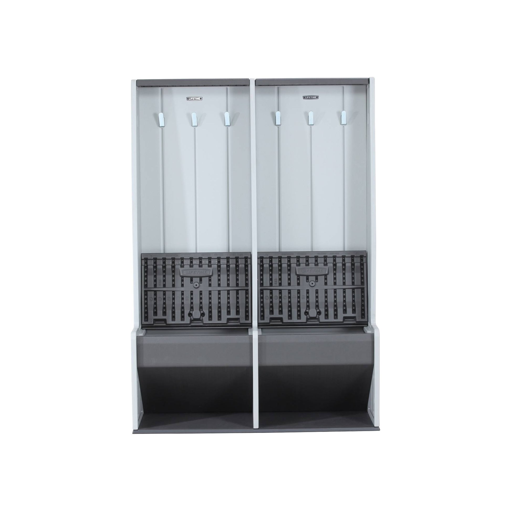 Ideal for storing workout and poolside essentials or organizing your mudroom. This storage locker features built-in hooks and benches, so you can take a seat while grabbing your gear. Dimensions: Height of the seat 18.7 inch. Overall height - top to bottom: 64.7 inch. Overall width - side to side: 45.2 inch. Overall depth - front to back: 18 inch. Overall product weight: 55 lbs.