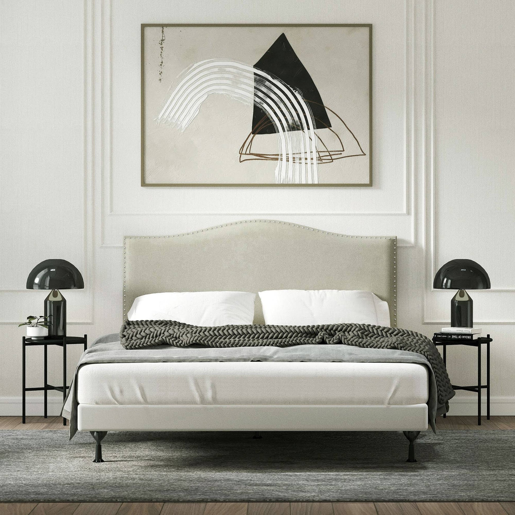 Bring a blend of traditional and contemporary style, and understated luxury to your bedroom with this upholstered headboard! Meticulously constructed with a solid and engineered wood frame, this headboard is wrapped in foam-filled, neutral polyester blend upholstery and finished with a classic camelback upholstered headboard design. The gentle curves give way to classic Nail head-Trim, adding a touch of contrast, definition, and character to the headboard. Simple assembly and the addition of a universal bedframe, mattress, and bedding of your choosing will have you in dreamland in no time. Frame and mattress sold separately. Hardware for mounting headboard to a bedframe is not included but available upon request.