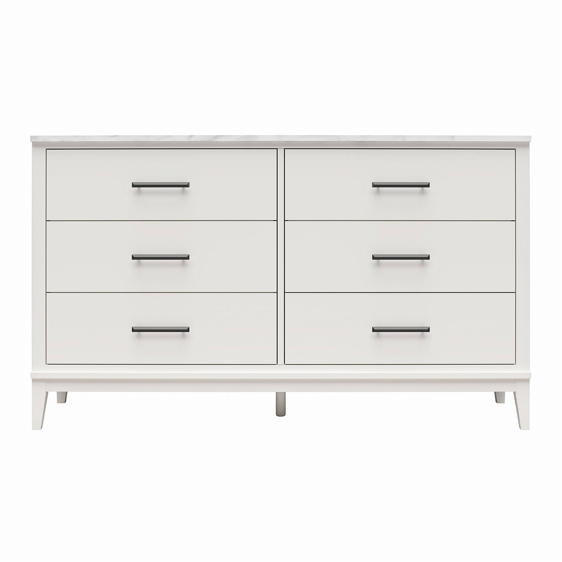 Upgrade your space with the luxurious and modern Lynnhaven collection from home. Stunning white and gray faux marble tops mixed with painted MDF engineered wood create a soothing and sophisticated bedroom ensemble. Give your closet some relief by storing your belongings in this gorgeous Wide 6 Drawer Dresser with durable metal slides. Tapered legs and elongated hardware pull this piece together to create a must-have bedroom look that will have you sleeping in. Assembly is required. Two adults are recommended to assemble. Once assembled, the Dresser measures to be 56.8 W x 15.6 D x 33.4 H.