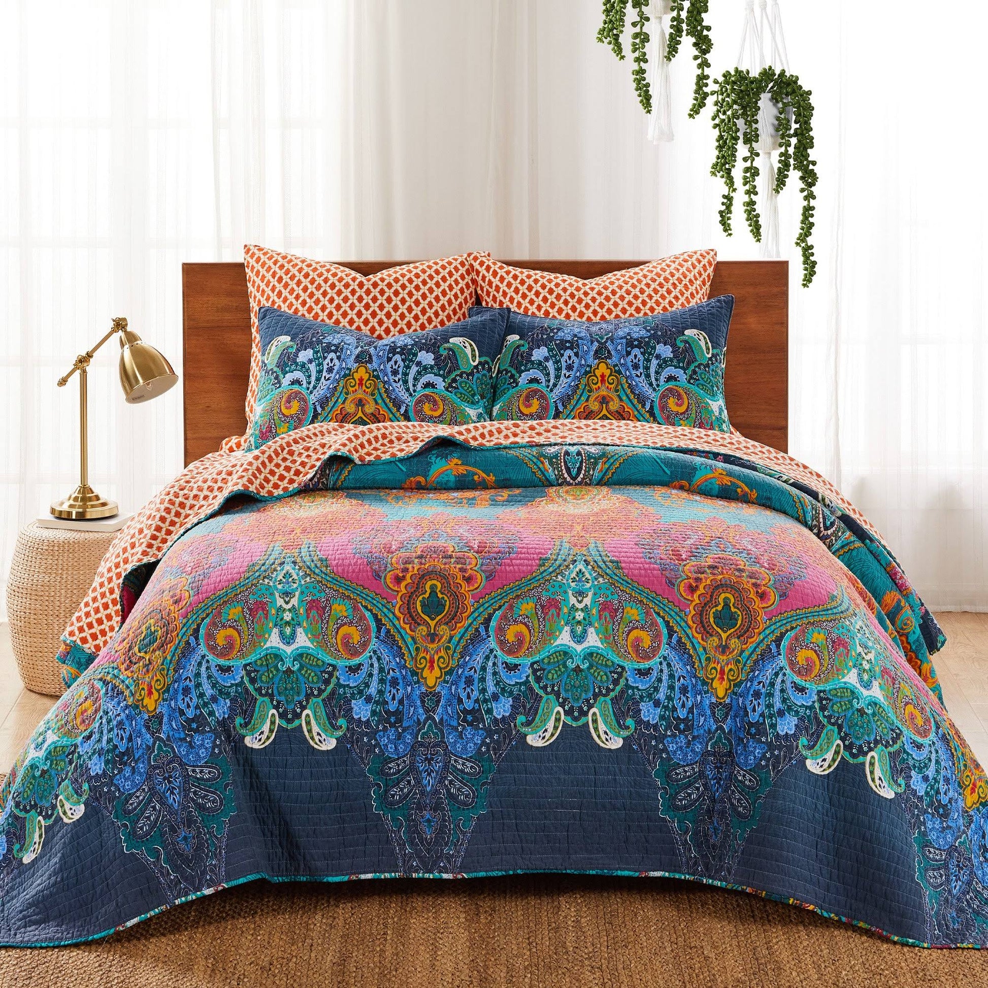 The Mackenzie Bedspread Set by Home is inspired by the vibrant patterns and colors of exotic bazaars. Offered in multi, this design will immediately transform your bedroom. This bedspread features a swirl of damasks and medallions in playful colors on the front, reversing to a orange and cream medallion on the back. The Bedspread (80x106in.) and Sham have a cotton front and back, filled with a cotton-rich filler, and are machine washable. Enjoy this for years to come!