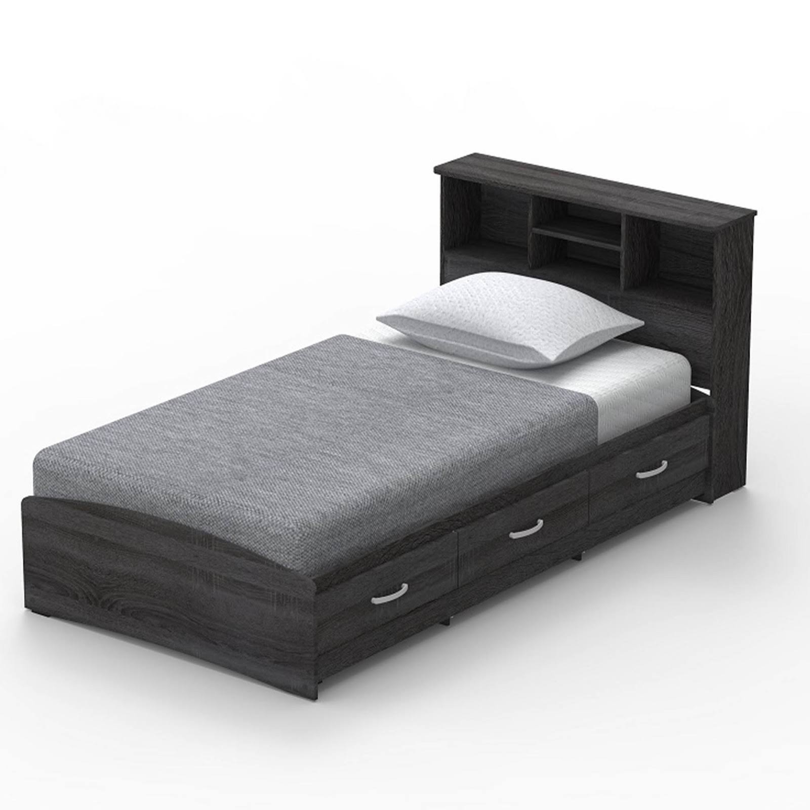 Functional and inviting, the Better Home Products California Wooden Twin Captains Bed has style and storage in spades. This sturdy engineered wood bed features three drawers (only on one side), bookcase headboard and t-molding finish. Finished with melamine lamination with scratch resistant qualities. The bed includes a slat support system, so it s completely mattress-ready; mattress required; not included. It s clean design will match any furniture or d cor in your room and will live through any future renovations. Assembly required. Available in White, Black, Tobacco, Mahogany, Beech, Gray, Beech & Blue, White & Pink color options.