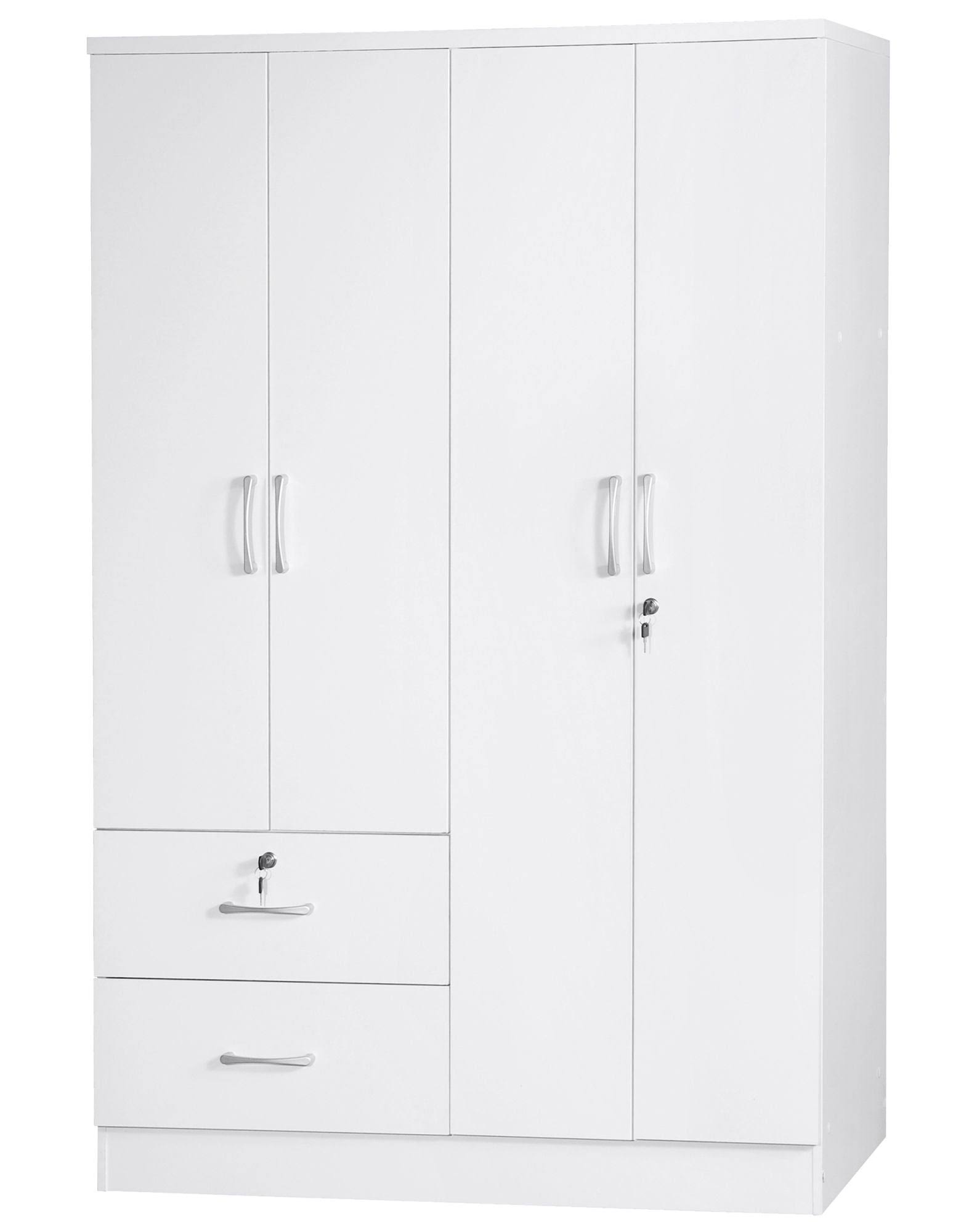 Crafted from high-quality laminated engineered wood, the Luna Modern Wood 4 Doors 2 Drawers Armoire is designed for greater sturdiness and durability. The free-standing wardrobe has two cabinets and two exterior drawers. The large cabinet is covered by two lockable doors and includes a clothing rod and a top shelf. The smaller cabinet also has two doors and includes clothing rod and two removable shelves. Under the small cabinet there are two drawers, each running on metal slides. The silver finish plastic bar handles complete the piece and add accessibility. Available in Beech (Maple), Black, Mahogany, Tobacco, and White color finish options. Assembly required.
