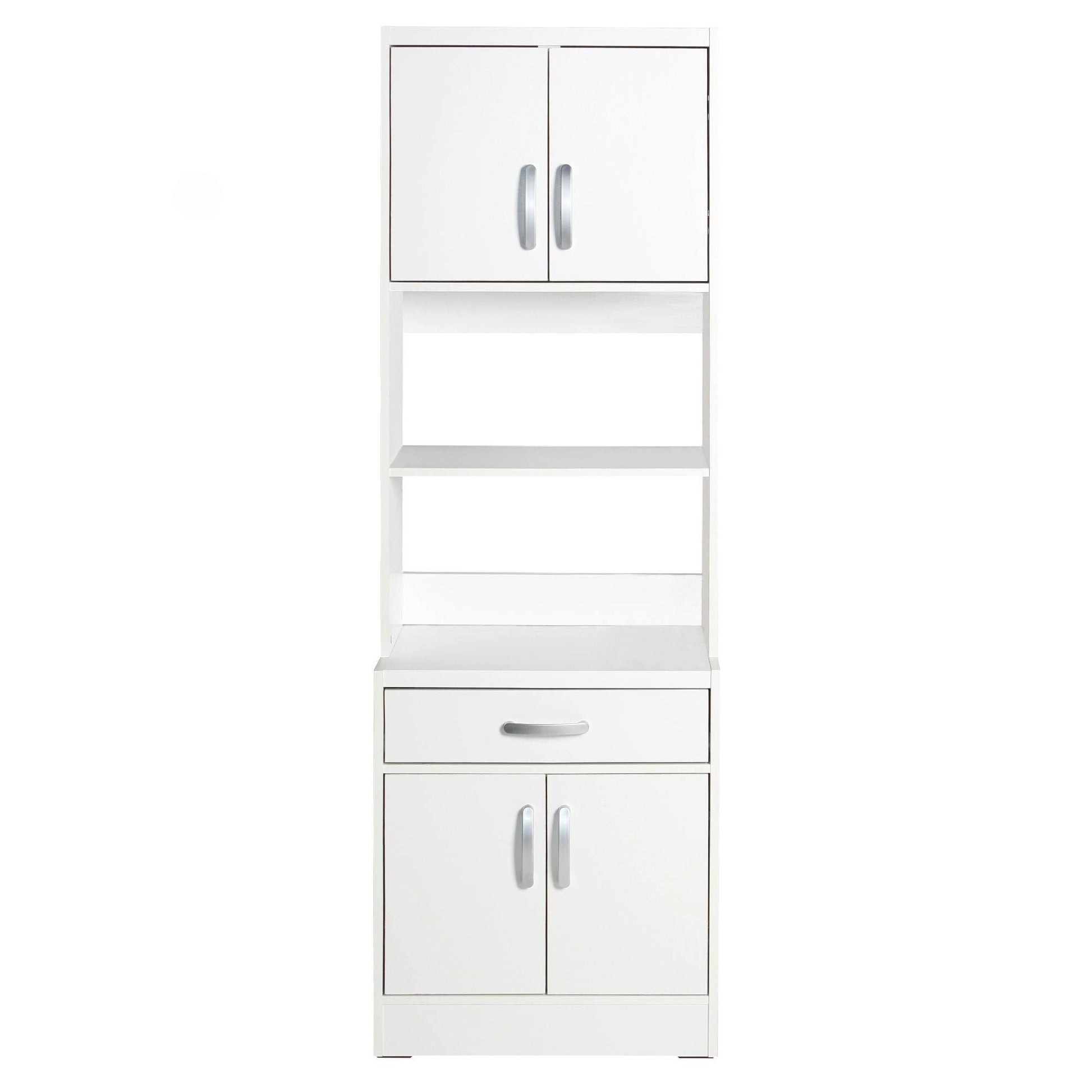 Finish White; Easy to assemble, simple and clear instructions and complete accessories are included. Do not use power tools to assemble your furniture. Crafted from engineered wood this kitchen pantry with microwave shelf is built to last. Dimension 16 inch D x 24 inch W x 71 inch H. Ample storage space - lower two door cabinet with an interior shelf, a drawer running on metal glides with safety stop, large open space for microwave, one open shelf for other small appliances and one two door cabinet on. Clean laminated surface and elegant silver finish plastic handles create a chic modern freestanding kitchen cabinet that will easily fit in with your kitchen, office, break room, pantry, or dining room decor. Item shape: Square Shelby 2136 Tall Microwave Cart with Drawer & Cabinet, Kitchen Storage A modern and functional microwave tall cart with storage helps you organize your kitchen stuff such as utensil and much more. This microwave storage features a drawer with upper and lower cabinet containing one shelf enclosed doors making it easy to locate that perfect mixing bowl or display your favorite kitchen accessories.