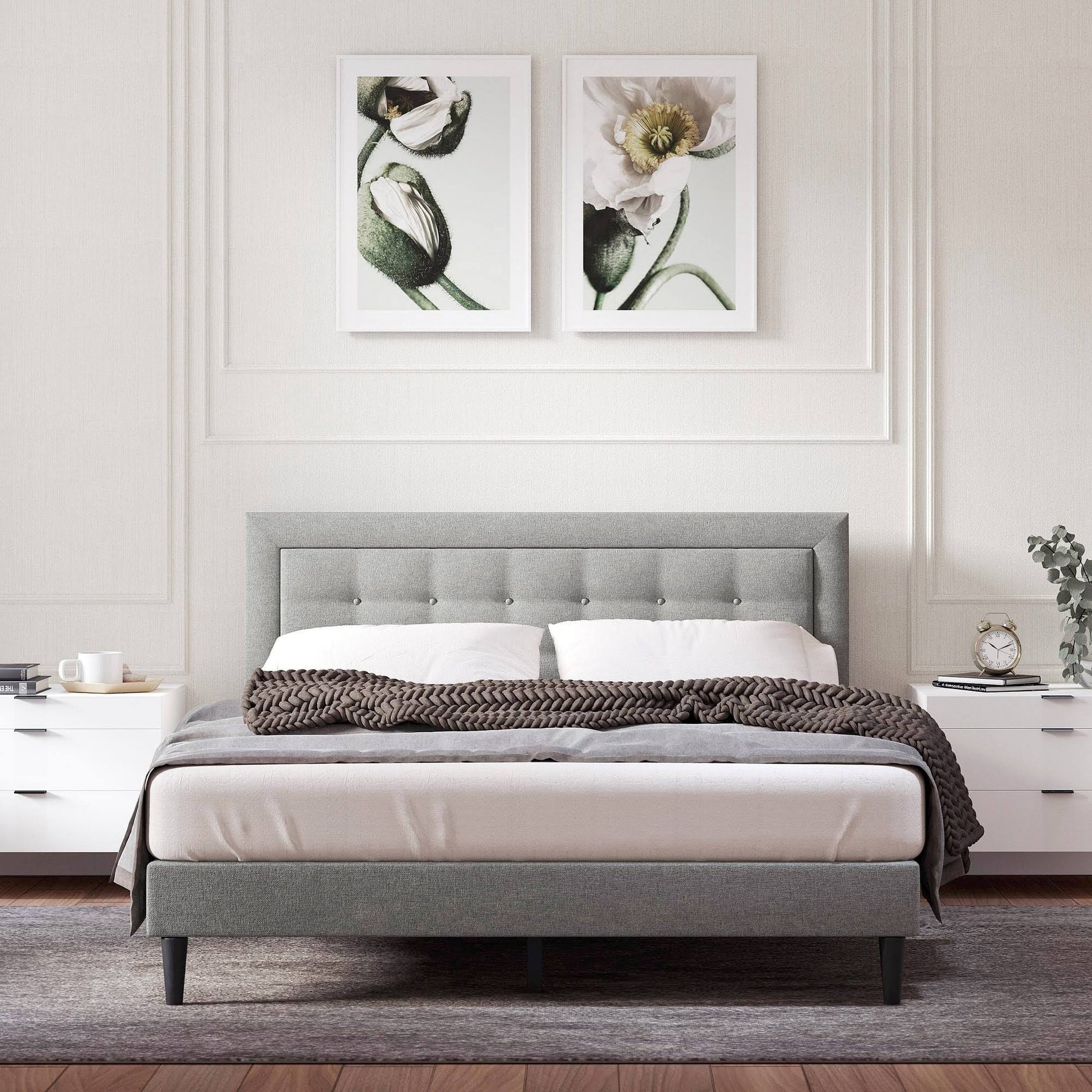 Timeless style blends with luxurious comfort with this upholstered platform bed. Meticulously constructed with a solid frame made from composite wood, this bed adds comfort with high-quality upholstery foam wrapped in easy-to-clean polyester blend fabric. The refined structure and square, button-point tufting of the headboard design create a calming balance perfect for restorative sleep. Solid legs in neutral black anchor the look. Simple assembly means you will have your new bed set up in minutes - just add your mattress and bedding. Unlike many competitors beds, our quality, wooden slats are specifically designed to pair with nearly all mattress types, from traditional pocket-coil/innerspring to memory foam, gel, latex, and hybrid and more.