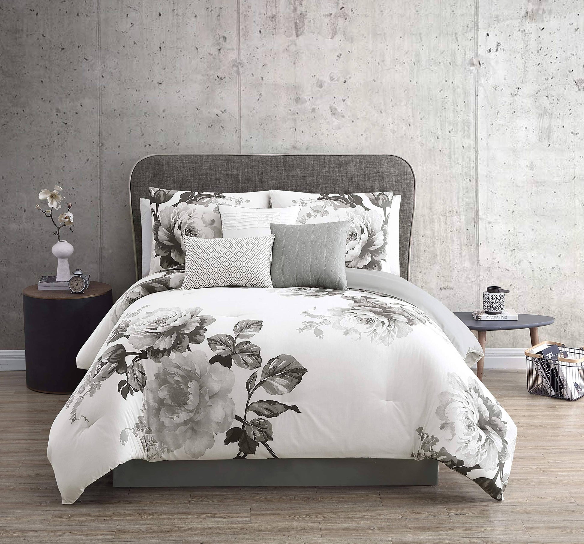 The Ridgely Black Cotton 7 Piece Comforter Set from Riverbrook Home is sheer perfection. The 100% cotton face comforter features an elegant large scale floral design in soft grey and black tones on ivory to create this stunning yet simple look. This 7 Piece Set includes: 1 Comforter, 2 Standard or King Shams, 1 Bedskirt, and 3 Bonus Decorative Pillows featuring pleating and quilted details, providing a convenient all-in-one package. 100% Cotton Comforter Face with Polyester fill. Machine Washable, follow care instructions on each piece for best results.