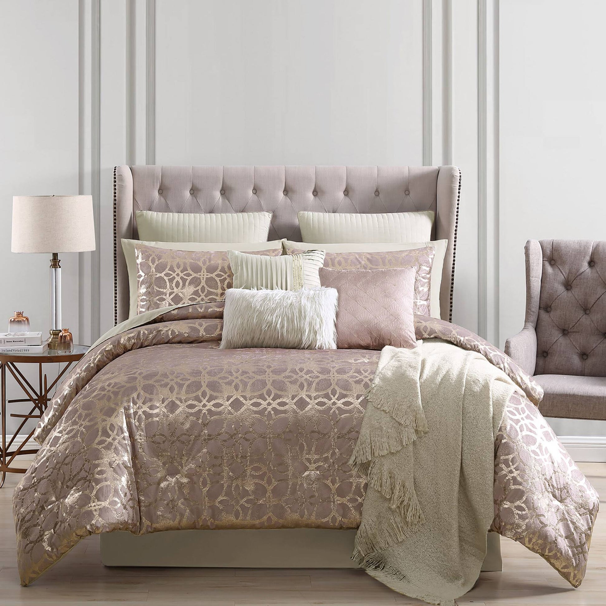 Bring sophistication to any décor with this luxurious blush colored velvet comforter set. This elegant set features a foil-printed metallic gold geometric pattern, complete with decorative pillows and euro shams. This 10 Piece Set includes 1 Comforter, 2 Standard or King Shams, 2 Euro Shams, 3 Bonus Textured Decorative Pillows, 1 bed skirt and 1 Throw. Machine Washable; follow care instructions on each piece for best result. Colors may vary from the actual product and your screen.