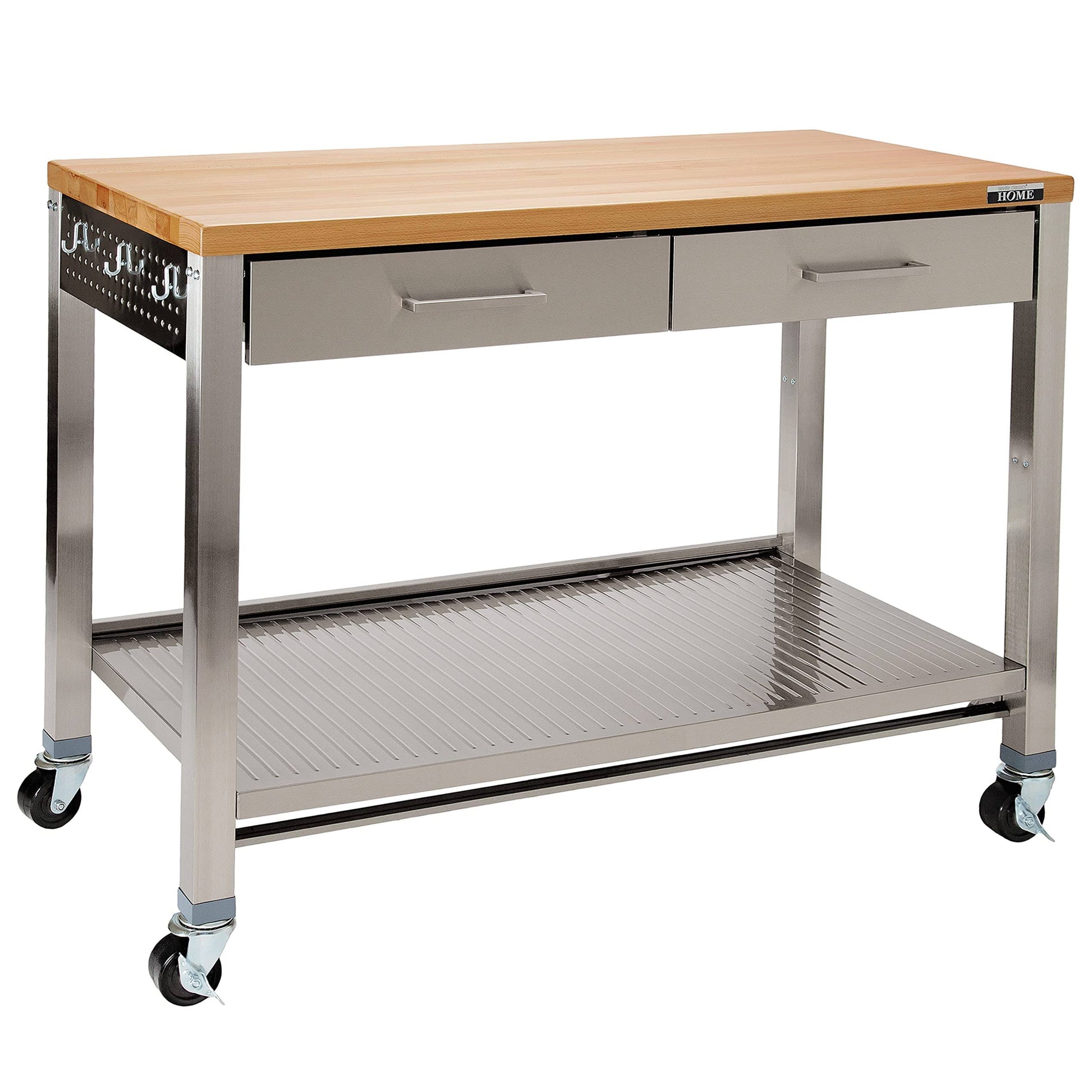 Designed for versatile use around your home, this stainless steel 2 drawer storage workcenter island kitchen cart by Home is built with quality craftsmanship and durability that will not disappoint. The 48 wide table to is crafted from solid 1.5 thick solid wood with stainless steel drawer fronts and shelf using UltraGuard, a patented finish designed to prevent smudges and fingerprints. Create more space in your home by storing your utensils or office items in the 2 steel drawers and taking advantage of the overall 440 lb. overall weight capacity. Each drawer has a non-slip liner to ensure your items stay in place. Roll the table anywhere you may need it using its 3 casters, 2 of the casters lock into place when youre ready to prep dinner, add a serving station for guests, or any other project you may have.