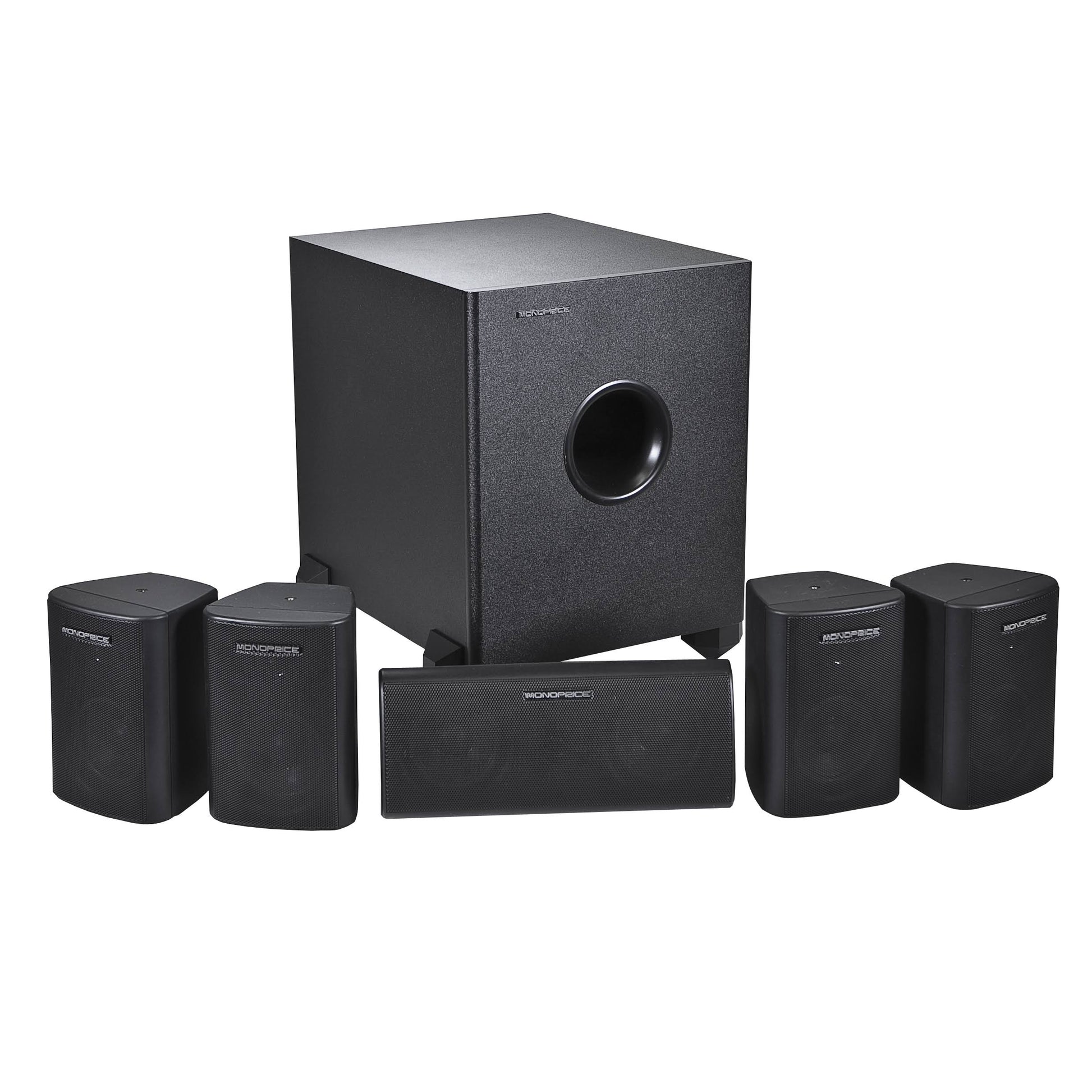 Surround yourself in high-fidelity with the 5.1-channel Home Theater Speaker System! Get everything you need for a great sounding home theater speaker setup in a single box! You get four satellite speakers and a center channel speaker for the mid- and high-range audio signals, plus an 8powered subwoofer to handle the low frequencies. All the speakers come with an attractive black finish and convenient spring-loaded signal connectors. The center speakers use two 3shielded mid-range cones, while the satellites employ one 3cone and a 1/2dome tweeter. However, don t let the small size fool you! These 8 ohm speakers will handle up to 125 watts of power from your home theater receiver at frequencies from 150 Hz to 20 kHz. The subwoofer is powered by a 60 watt (RMS) amplifier, driving a downward firing 8cone. It can take either line or speaker-level inputs, so can be used with any amplifier, even older amps without dedicated subwoofer outputs. The subwoofer handles frequencies between 50 Hz to 250 Hz and includes adjustable crossover frequency and volume balance controls. Also included in the box are four C brackets for mounting the satellite speakers to the wall and the necessary hardware for mounting the speakers to the brackets. A pair of plastic feet to properly orient the face of the center speaker is also included. Note that you will need to provide your own hardware for mounting the C brackets to the wall or other vertical surface. Don t let the low price fool you! This speaker system sounds great and will fill your room with high-quality, full-spectrum sound! Note: The speaker wire connectors on each unit comfortably accept a maximum 16 gauge speaker wire. For best results, strongly recommends using pin-type speaker plugs to make the speaker connections and banana or pin-type plugs to connect the wires to your amplifier. See the section below for links to these products.