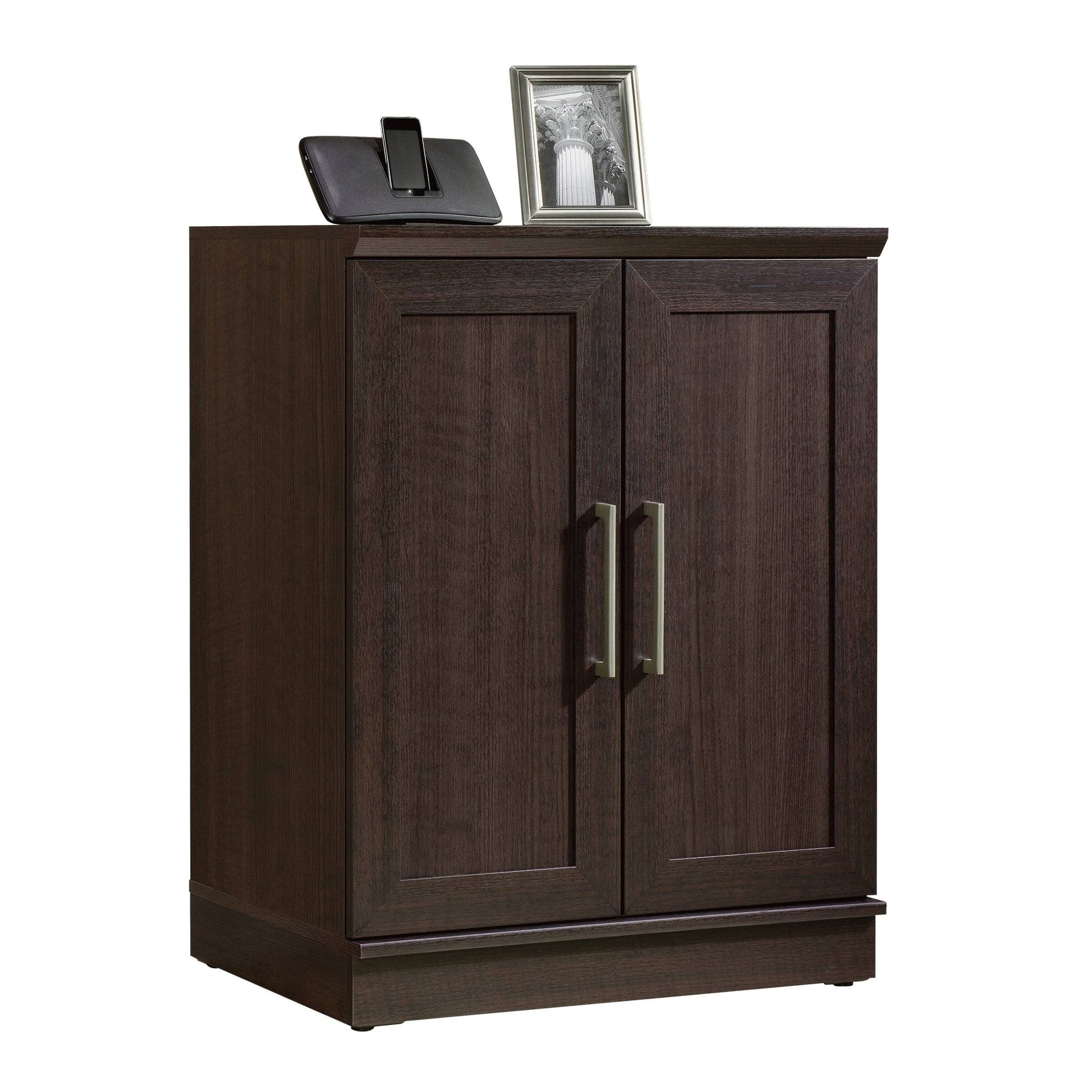 Constructed of environmentally friendly engineered wood. Adjustable shelf behind framed panel doors. Enclosed back panel has cord access, adjustable base levelers. Make your space more functional with the addition of the Homeplus Base Cabinet. This lower cabinet features an adjustable shelf for ideal storage. The silver handles are a modern complement to the rich finish. Dimensions: 17L x 29.63W x 37.38H.