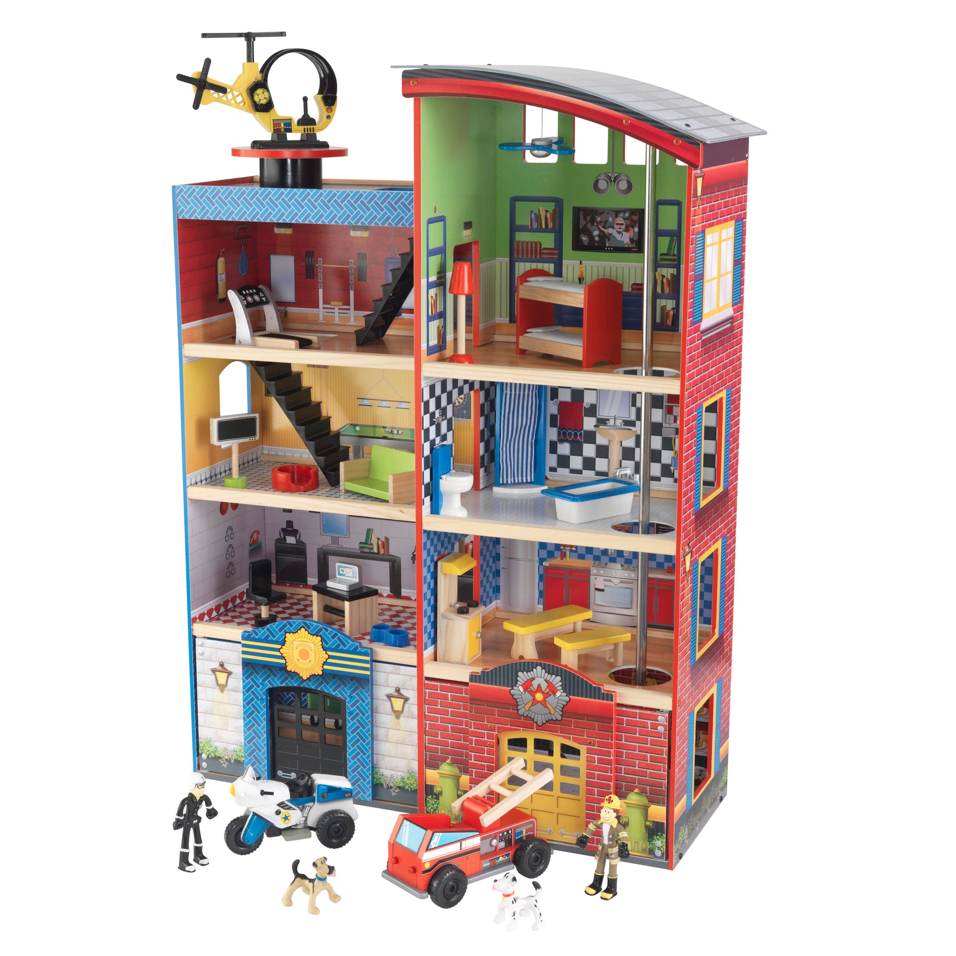 Kids have a fun opportunity to learn about real-life heroes with the Hometown Heroes Play Set. With four towering stories, there is plenty for kids to explore and imagine. The bendy fireman slides down the pole to the bottom floor where his bendy Dalmatian waits by the fire truck. Next door, the policeman stands by with his motorcycle ready to race off and stop the bad guys. With 24 accessories to play and decorate, kids will have endless fun with this playset.