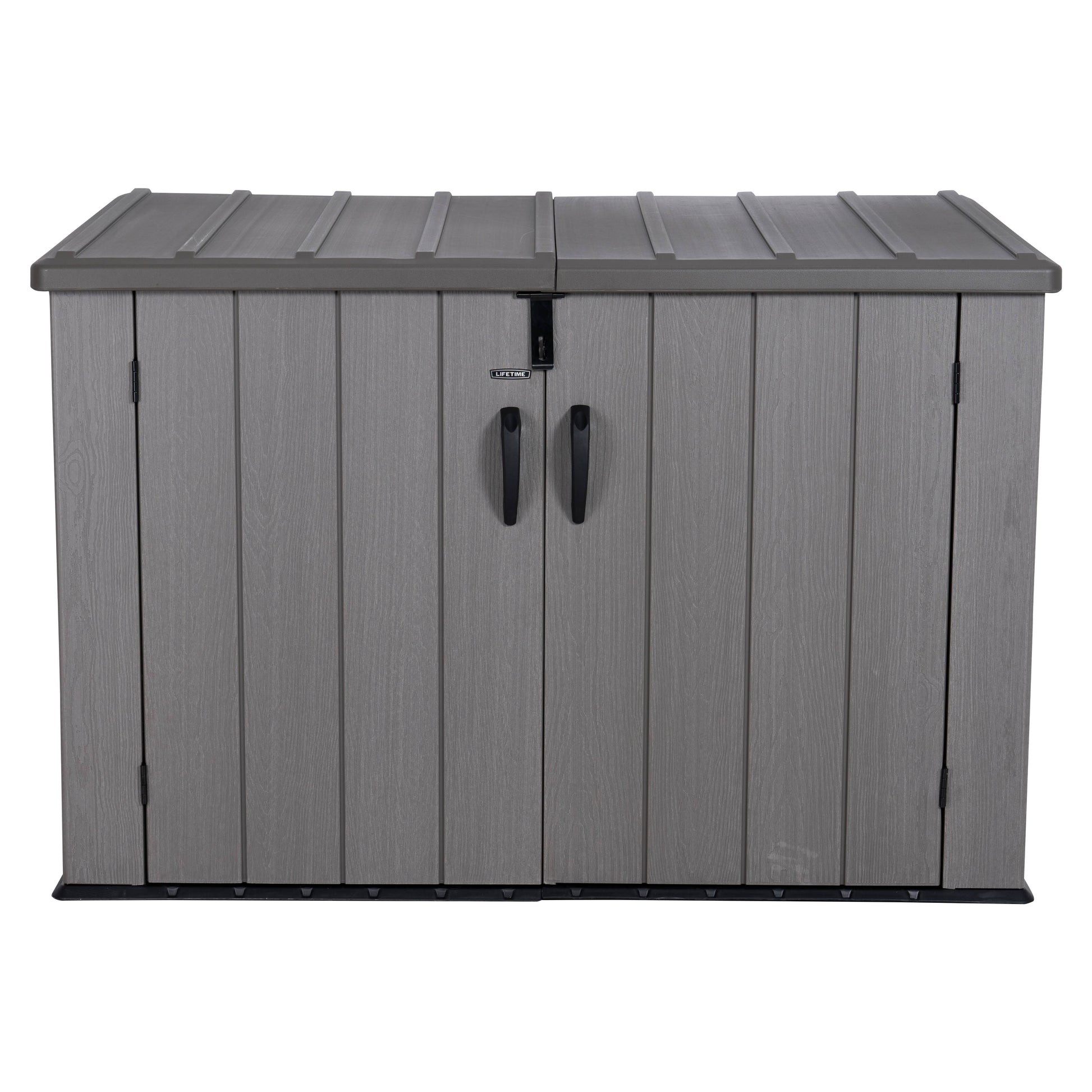 s Horizontal Storage Shed is the perfect way to expand your storage and get better access to those items you use regularly. Whether you have tools, lawn equipment, bikes or trash bins, the Horizontal Shed makes them easy to store and find when needed. The Rough Cut Series features a wood-grain texture and a rough-cut finish that s easy to maintain, requires no paint and looks great in your yard. It s durable, UV-protected and weather resistant to ensure your belongings have years of protection. The doors are steel reinforced and lockable (lock not included) to provide even greater security. The top lid with a control spring hinge opens up easily so you can easily place or remove items inside. The Horizontal Rough Cut Shed blends durability, convenience and style to create the optimal storage solution. Please check your local HOA, zoning laws and site dimensions for shed use and installation requirements. Site prep and foundation are required but not included. See link below for more details.