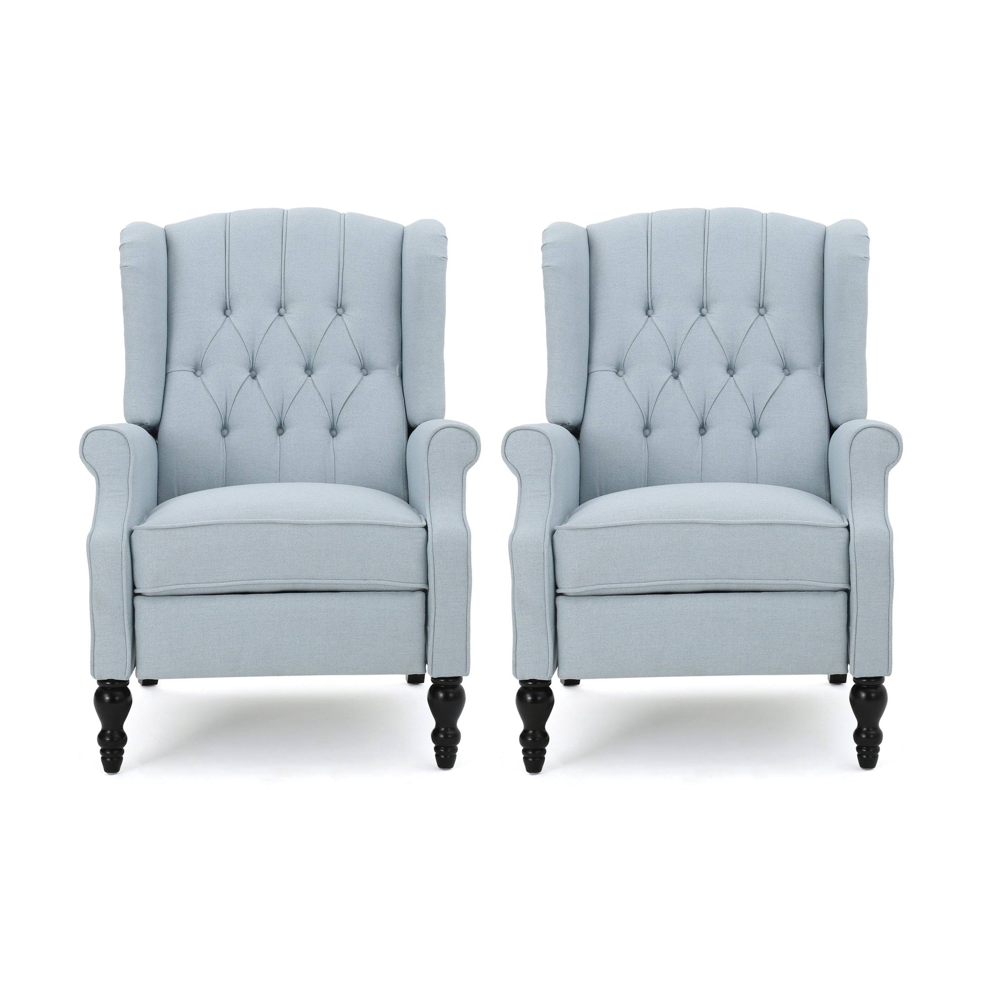 Luxurious comfort and refined style are at your fingertips with our timeless recliner. Sure to bring your interior space a stunning upgrade, our armchair uses a smooth pushback reclining mechanism and carefully crafted accents to tie your home together with absolute sophistication. This pushback recliner features gorgeous details such as button tufting, diamond stitching, tonal piping, and an outstanding studded trim to bring your decor to the next level. Finished with a lovely wingback design and rolled recessed arms, our recliner is as stylish as it is functional. Material: Fabric Fabric Composition: 100% Polyester Leg Material: Birch Color: Light Sky Leg Finish: Dark Brown Assembly Required Dimensions: 34.50 inches deep x 28.50 inches wide x 41.00 inches high Extended Dimensions: 62.00 inches deep x 28.50 inches wide x 29.00 inches high Seat Dimensions: 21.00 inches deep x 20.00 inches wide x 19.25 inches high Arm Height: 24.75 inches
