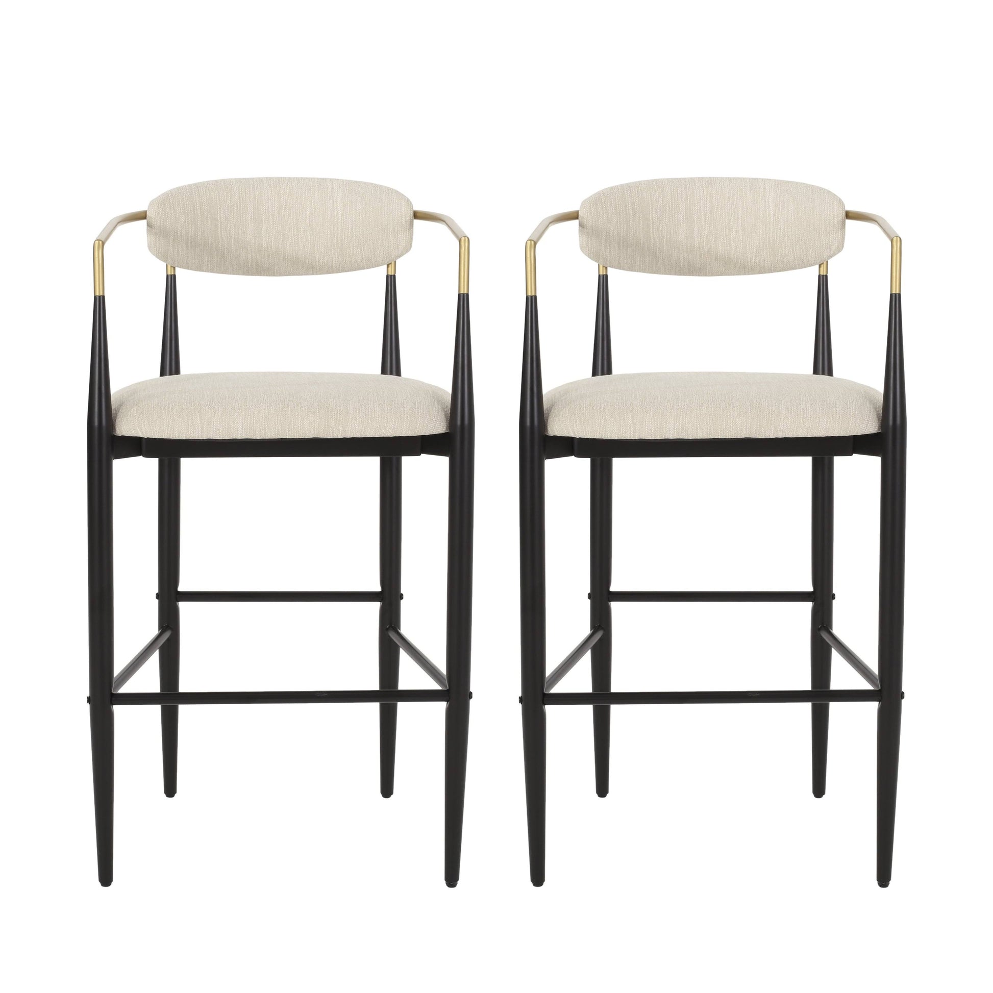 Absolute sophistication. There are no better words to describe this seating set. Featuring smooth upholstery and sleek black frames with stunning gold accents, our striking set of two barstools offer a chic modern look to any home. The frames are crafted from durable iron and feature an exquisite toothpick design, perfectly complementing the open backrests. Our barstools give you and your guests a stylish and sturdy place to dine effortlessly at your home bar or to enjoy a few cocktails with your friends. Color: Beige and Black.