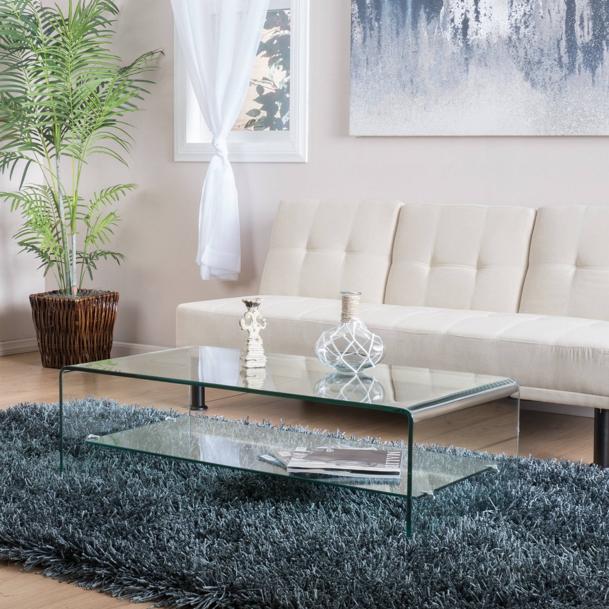 The roman glass coffee table with a shelf is a sleek and contemporary option for storage and style in any room of your home. The transparent glass and aluminum leg frame exude a sophisticated presence that can be just as functional as eye-catching for you and your guests. In rare instances, tempered glass furniture that is damaged by chips or scratches may break, seemingly of its own accord. Damage to the glass (not always visible) can get worse over time until it reaches a critical point when it may shatter. In the event of damage, this product is designed to shatter into lots of small granular pieces rather than large shards. This is a safety feature to reduce the risk of injury. WARNING: Risk of Shatter Associated with Glass Furniture.