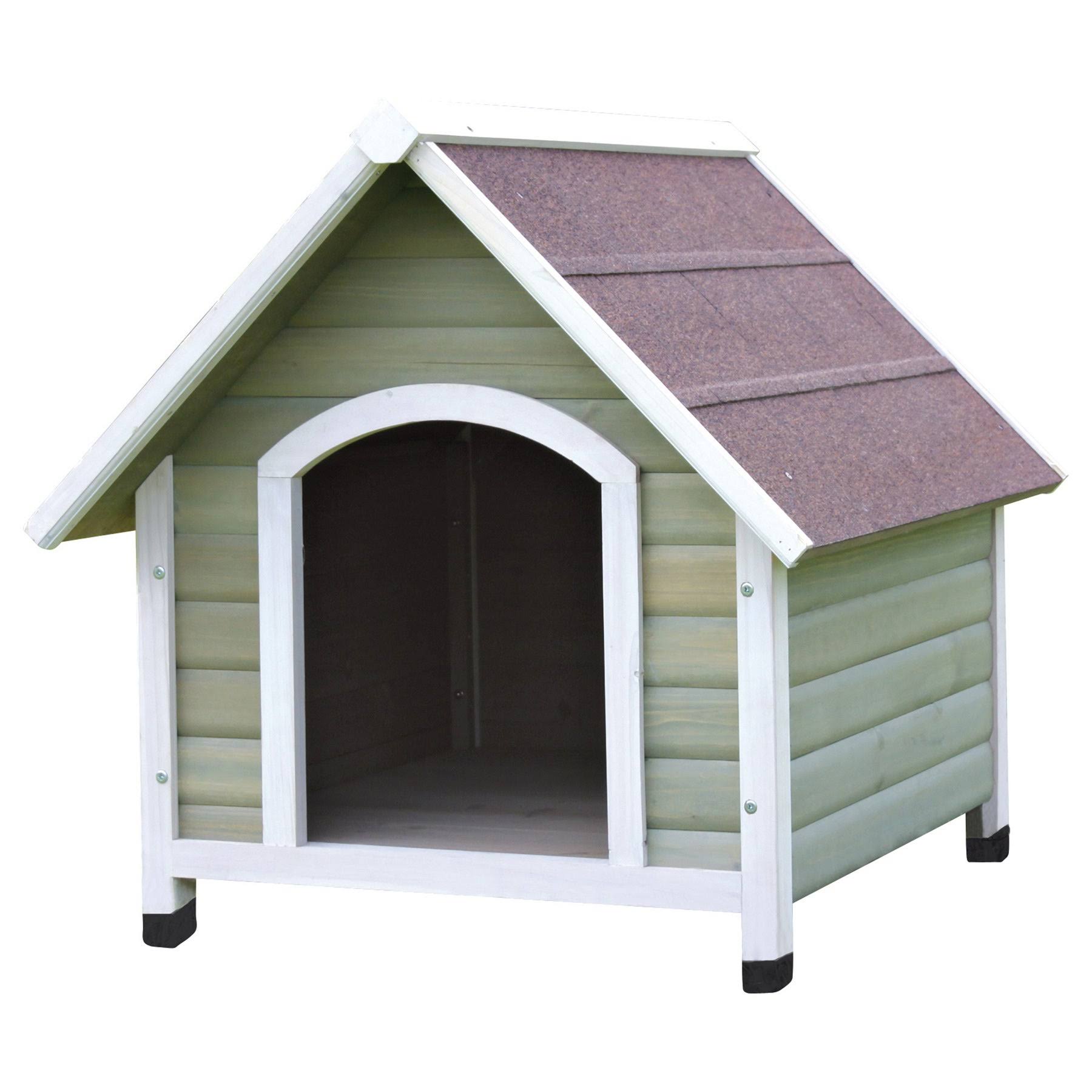 Sturdy, weatherproof glazed pine construction. Composite granulated shingled roofing. Plastic tipped legs ensure ample circulation below dog house. Choice of sizes. Light assmbly required. Set up your puppy in style with a Trixie Natura A-Frame Dog House. Its sturdy, weatherproof glazed pine construction stands up to both harsh summer and winter conditions. A composite granulated shingled roof ensures that your best friend will always have a dry roof over his head. Plastic tipped legs support the underside of the dog house, maintaining proper air circulation. Some light assembly is required, but your dog will love you forever when the house is complete. Size Dimensions: Medium: 31.5W x 37D x 33.25H inches.