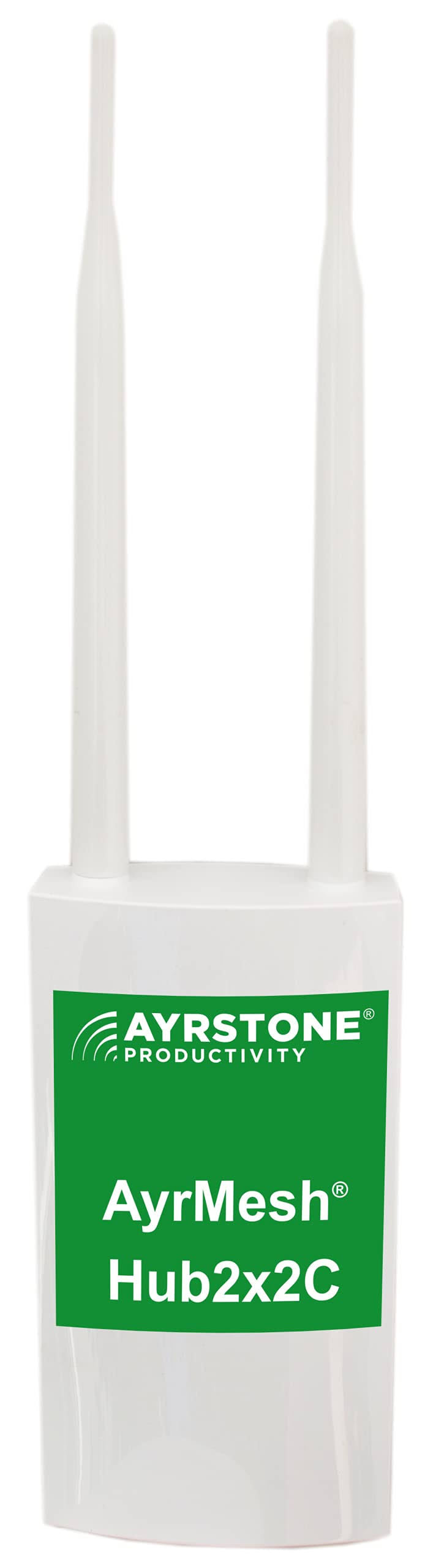 The AyrMesh Hub 2x2C is the foundation and building block of the AyrMesh system for smaller properties that need more intensive WiFi coverage. Like all AyrMesh Hubs, it is a high-power outdoor meshing access point created specifically for rural locations. The Hub2x2C is more compact than the other Hubs, with slightly lower power and lower-gain antennas, enabling them to be placed less than half a mile apart for continuous WiFi coverage.