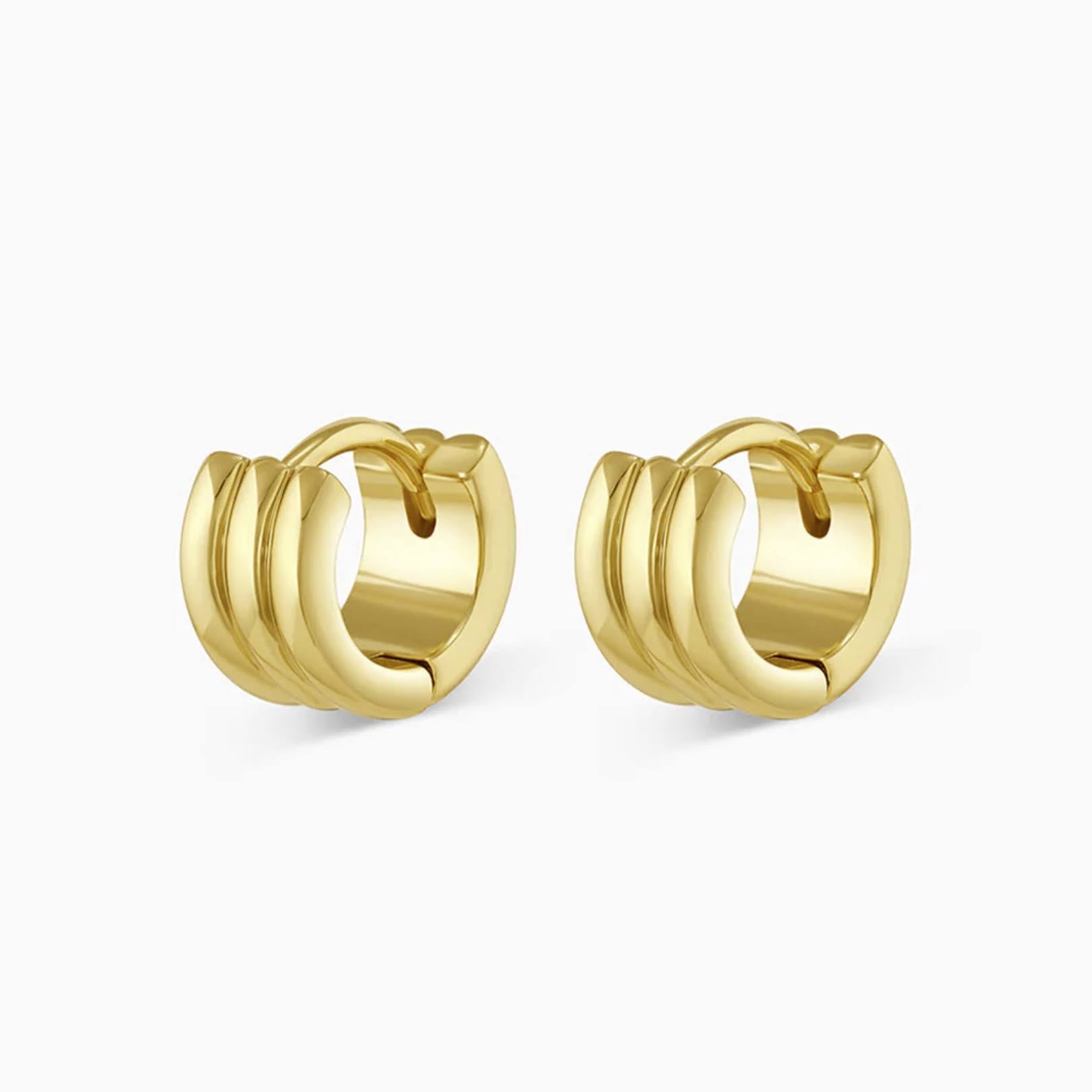 These Reed Huggies add subtle sophistication to any style. Crafted from textured gold-toned metal, their classic yet stylish huggie hoop design make them the ideal accessory for formal or casual occasions. Elevate your look with Reed Collection pieces. 7/16profile diameter 1/4wide and 1/16thick Hinge post closure Available in 18k gold plated brass Avoid contact with anything containing derivatives of alcohol