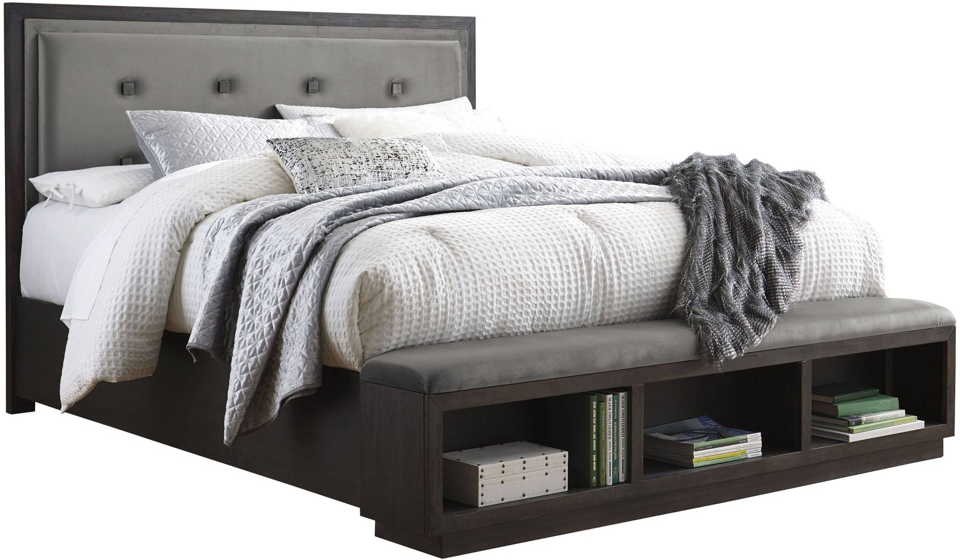 By pairing contemporary design with rich elements this bed is sure to bring sophistication and a touch of romance to your bedroom. The bed dark espresso finish and bright nickel-tone hardware made even more dramatic with the addition of the modern plinth base complement the sleek style. Eight smooth-gliding drawers generously accommodate your wardrobe needs.